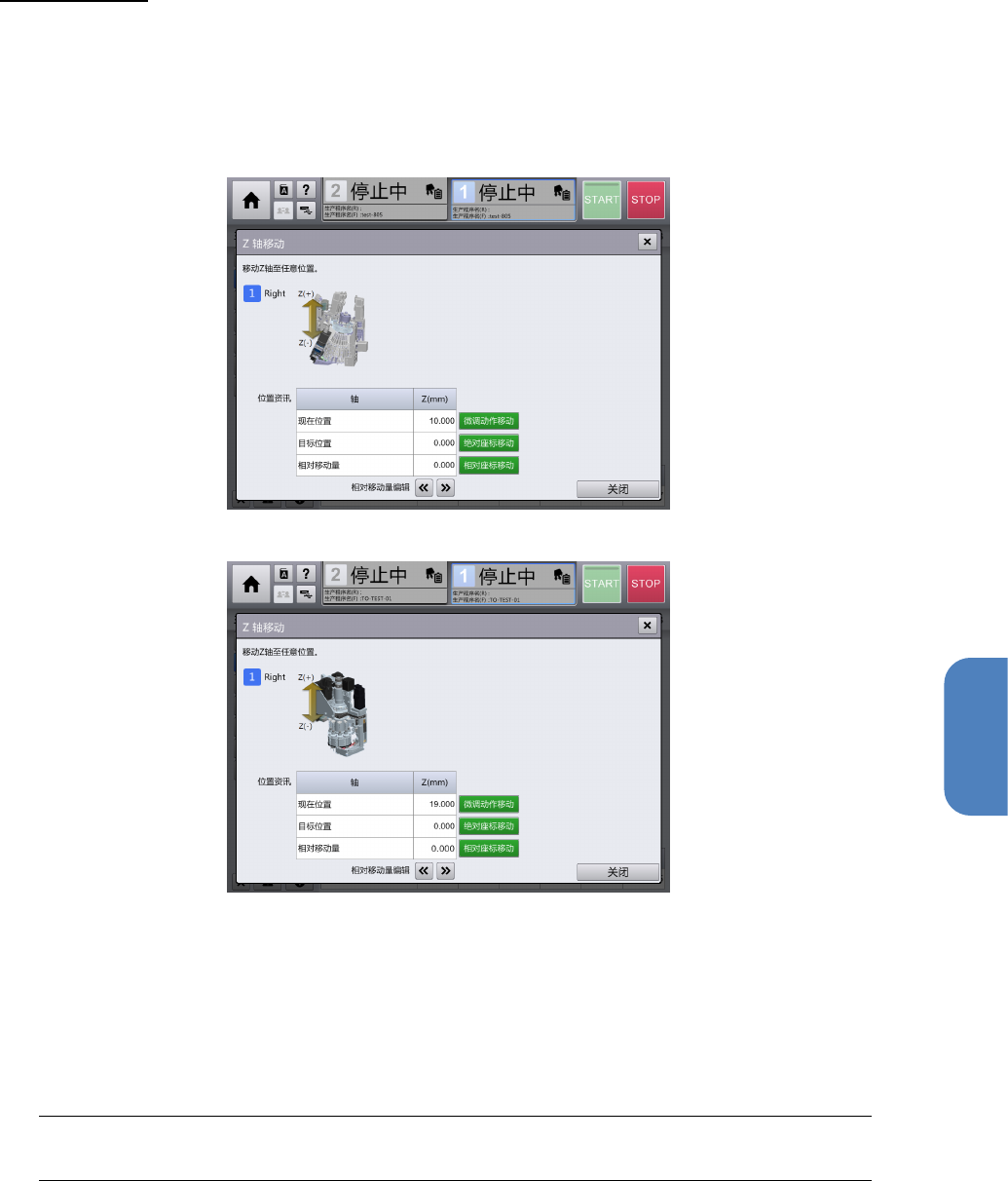第 4 章 操作篇 4- 9. 手动控制 139 4 Z 轴的绝对移动 触摸 [ 贴片头 控制 ] 画面的 [Z] ,显示 [ Z 轴移动 ] 对话框。 可将整个贴片头 移动到上下( Z 轴)任意位置。 [ 位置资讯 ] 的 [ 现在位 置 ] 中将显示 Z 轴的当前 位置。 ■ 贴片头类型为高速时 ■ 贴片头类型为通用 时 1 触摸 [ 目标位置 ] 文本框,输入移动目标位置。 2 触摸 [ 绝对坐标移动 ] 。 Z 轴将移动到 [ …