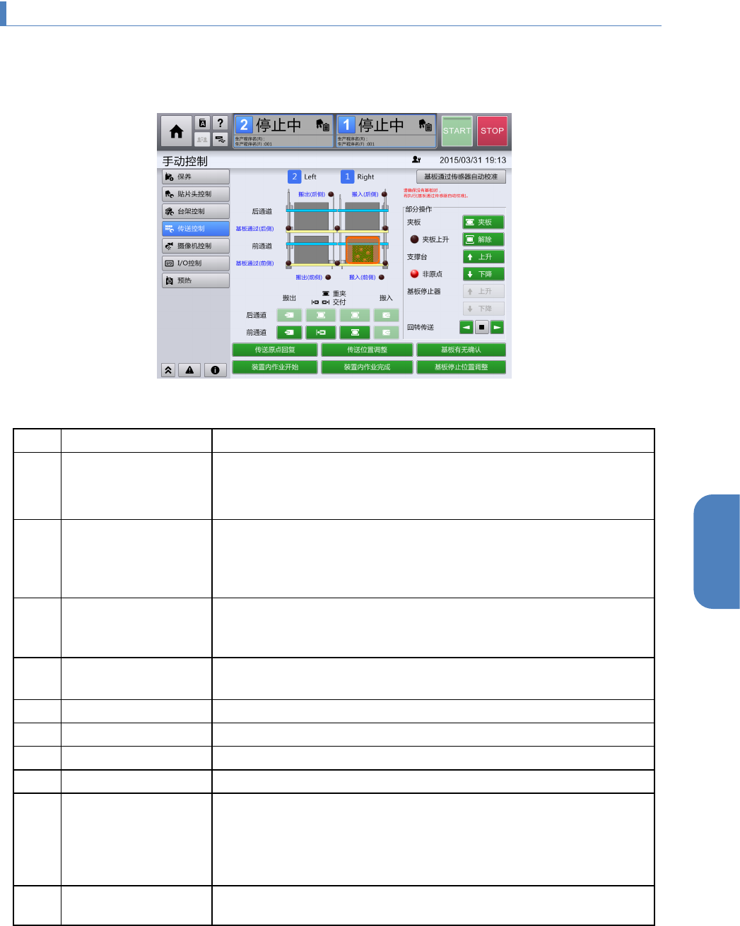第 4 章 操作篇 4- 9. 手动控制 151 4 4-9- 4. 传送控制 触摸 [ 手动 控制 ] 菜单的 [ 传送 控制 ] ,显示 [ 传送 控制 ] 画面。 [ 传送控制 ] 画面仅在用 户级别为 [ MAINTENANCE ( 维护 ) ] 时,才会显示。 记号 名称 说明 (a) 基板 有无确认 执行传送通道上 的基板有无确 认。 与 [ 传送单元图 像 ] 的选择无关,对所 有站点的基板有无进 行确认。 (b) 基板 …