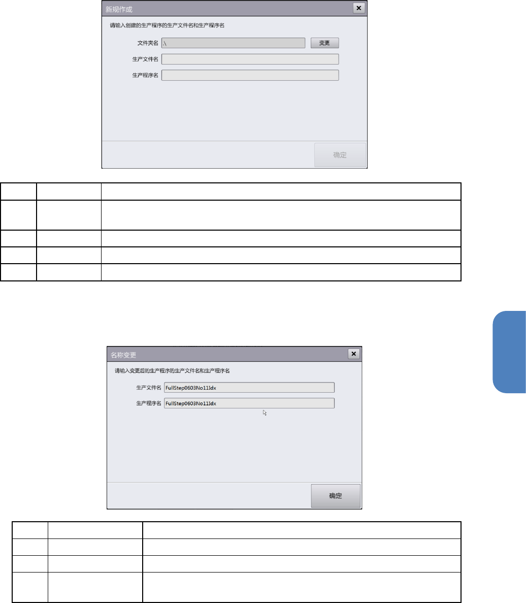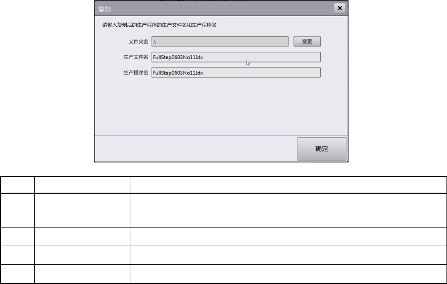 第 4 章 操作篇 4- 10. 文件管理 164 [ 复制 ] 对话框 用选 择的生产程序生成不同名 称的生产程序 。生产分组名称与原 文件相同。 记号 名称 说明 (a) 文件夹名 显示复制生产程 序后的目标文 件夹名称。 触摸 [ 变更 ] 显示 [ 文件 夹变更 ] 对话框,可更改 文件夹名称。 (b) 生产 文件名 输入 生产程序的 [ 生产文件名 ] 。 (c) 生产程序名 输入 生产程序的 [ 生产程序名 ] 。 (d…