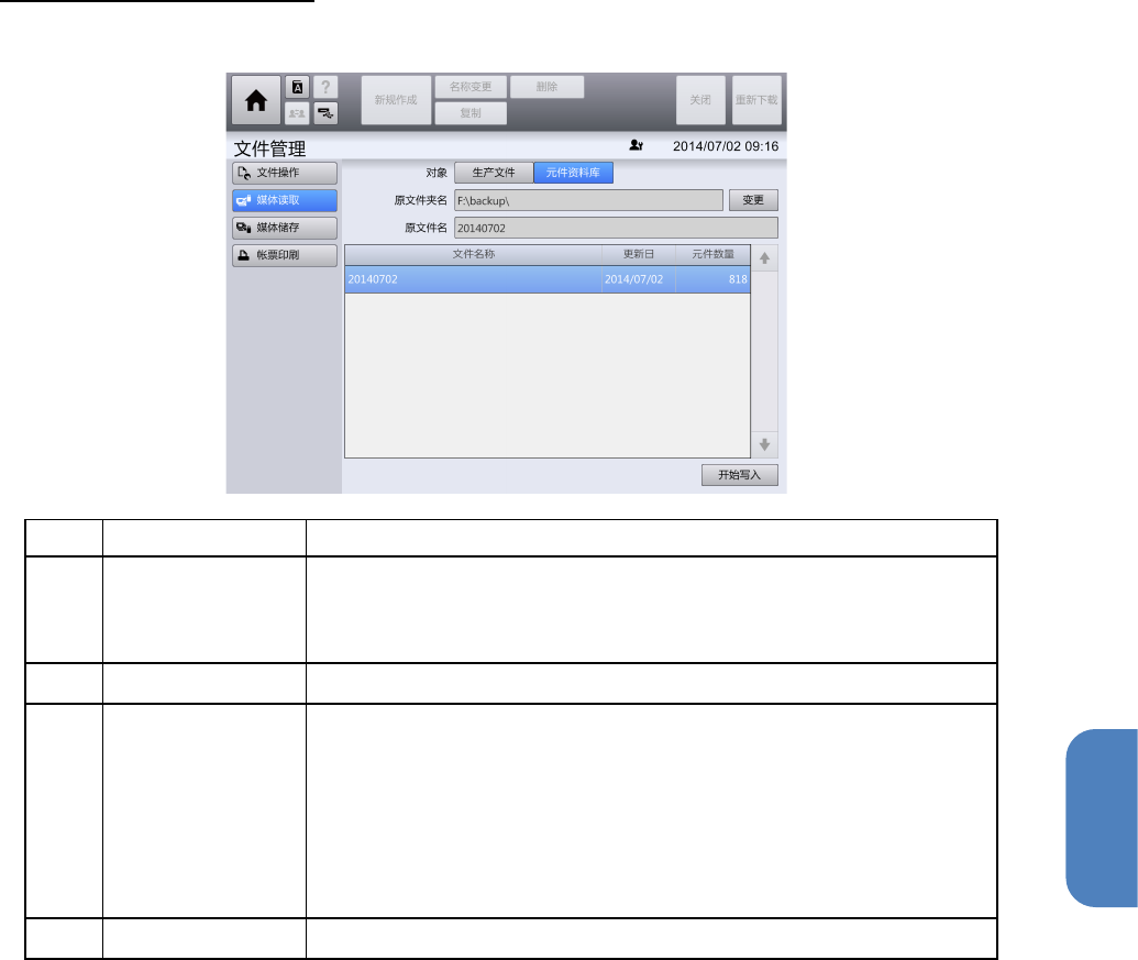 第 4 章 操作篇 4-1 0. 文件管理 171 4 媒体读取画面(元件 资料库) 选择 [ 元件 资料库 ] 记号 名称 说明 (a) 原文件夹名 显示读取源 USB 存储 设备中元件资料库的 保存文件夹名 称。 触摸 [ 变更 ] 显示 [ 文件 夹变更 ] 对话框,可更改 读取源文件夹。 详情请参阅「 4- 10 - 2. 文件操作 」的「文件夹更改对话框 」 (b) 原文件名 显示在文件列表 中选择的元件 资料库文件的名称…