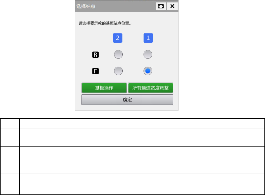 第 4 章 操作篇 4- 11. 编辑生产程序 180 [ 选择站点 ]对话框 在[编辑生产程 序] 菜单 画面中触摸共通面 板的[选择站点], 即显示[选择站点] 对话框。 记号 名称 说明 (a) 选择站点按钮 用按钮选择要在 示教中使用的 站点位置(单元编号 [1] 或 [2] 、以及通道 号 [F] 或 [R] )。 (b) 基板操作 显示 [ 基板操作 ] 对话框,以便 进行示教将使用的基 板将传入到站 点位 置。 [ 基板操…