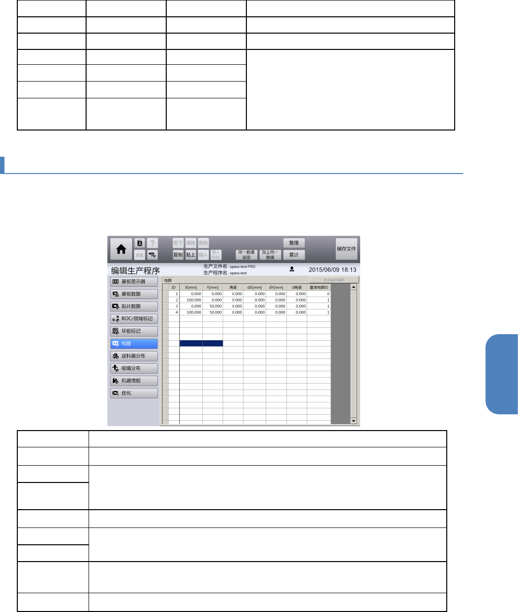 第 4 章 操作篇 4- 11. 编辑生产程序 194 电路 的坐标位置 电路 的各坐标位置中,将从 NC 原点到各 电路 基准所在位 置的补正值 作为 X , Y 及角度输入。 如下所示,对 1 块基 板上有 4 个 电路 的数据进行输入时, 先确定基准 电路 ,然后输入 该电路的基准坐标 位置。 除基准 电路 外,其他 电路 将以 NC 原点为基 准,计算角度的补正 值并求出坐标 ,然后将该坐标位置 在 XY 方向上的补正值 作…