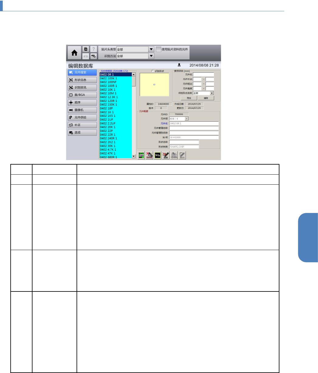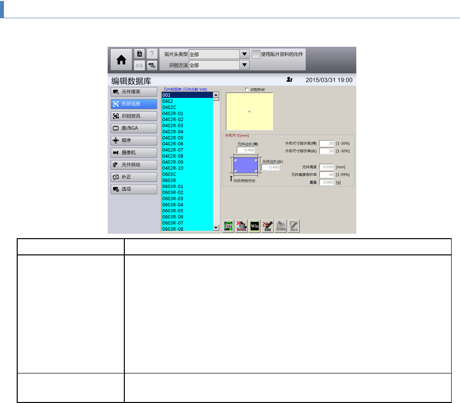 第 4 章 操作篇 4- 12. 编辑数据库 212 4- 12 - 3. 元件的形 状信息画面 可显示 元件 资料库中注册的元 件资料之元件 大小信息。或者在各 字段中输入,编辑大 小信息。 名称 说明 外形 尺寸 [mm ] • 元件 边长(横):输入方形 元件 的 元件 边长(横)的尺寸 。 • 元件 边长(纵) :输入方形 元件 的 元件 边长(纵)的尺寸 。 • 元 件高度:输入 元件的高度。 • 重量 :输入元件 的重量。 …