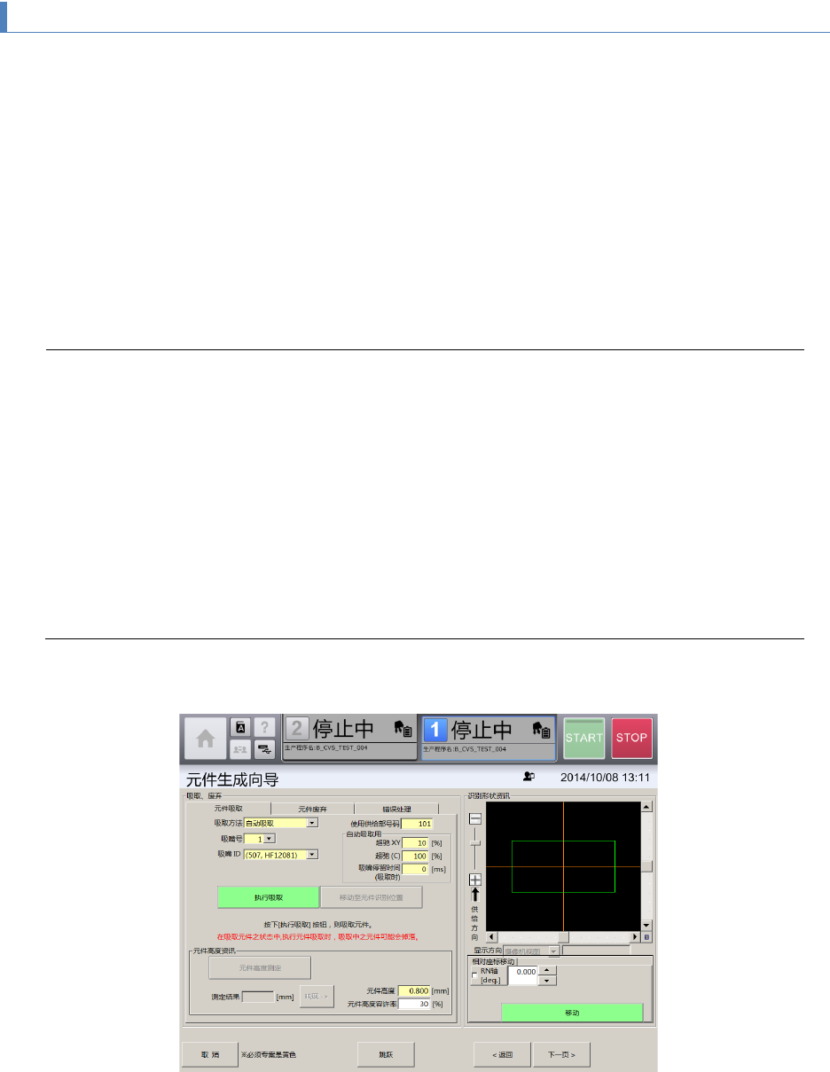 第 4 章 操作篇 4- 13. 元件生成向导 228 4- 13 - 3. 吸取 ・ 废弃 画面 在 [ 元件吸取 ] 选项卡中,为了以吸嘴 实际吸取元件 时的摄像机图像为基 础制作元件 识别 数据,可对元件进 行自动吸取或手 动吸取。 操作 对象单元,可通过共通面 板进行切换。 [ 吸取方法 ] 选择 [ 自动 吸取 ] ,触摸 [ 执行吸取 ] 时,即从使用供给部 号码中指定的供料器 进行元件的 吸取 。供 料器的 空洞 位置会自…