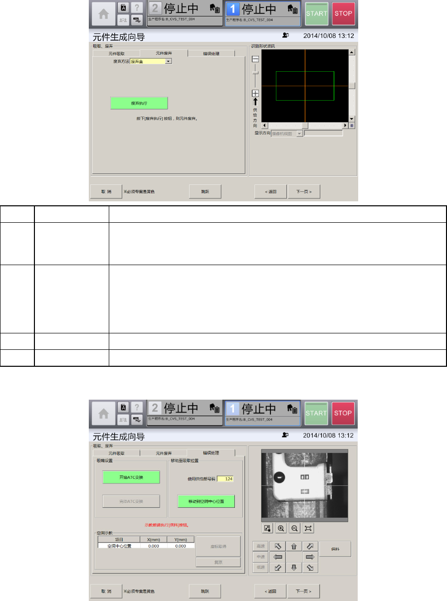 第 4 章 操作篇 4- 13. 元件生成向导 230 选择 [ 元件废弃 ] 选项卡 记号 名称 说明 (a) 废弃方法 通过下拉列表选 择元件的废弃 方法。 • 废 弃盒:自动将 元件废弃到废弃盒。 • 手动废弃:手动 从吸嘴将元件 取下。 (b) 废弃执行 废弃吸取的元件 。 在 [ 废弃方法 ] 中选择了 [ 废弃盒 ] 时, 自动废弃到废弃盒。 在 [ 废弃方法 ] 中选择了 [ 手动 废弃 ] 时,贴片头会移 动到近前,…
