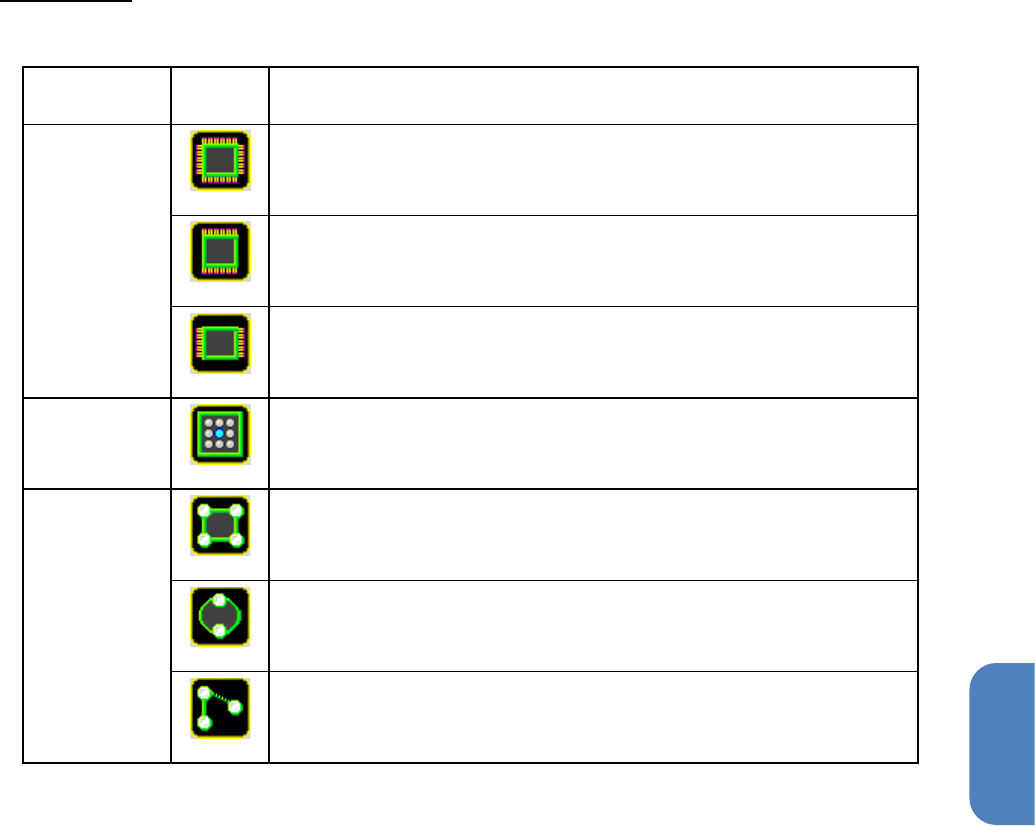 第 4 章 操作篇 4- 13. 元件生成向导 240 编辑按钮 对象 按钮 说明 外形 尺寸 显示 外形尺寸的元件 中心 设定用的编辑标记 。 蓝色标记:设定 元件中心位置 歪斜设定 显示本体的歪斜 设定用的编辑 标记。 黄色 标记:设定本体的歪斜 脚 显示用于移动脚 基准位置的编 辑标记。 触摸蓝色标记设 定脚基准位置 。 显示用于设定脚 长度 / 宽度 / 间距的编辑标记 。 白色标记:更改 脚长度,脚间 距 橙色标记:更改 …