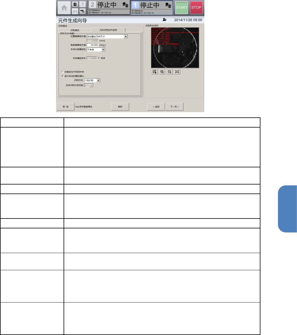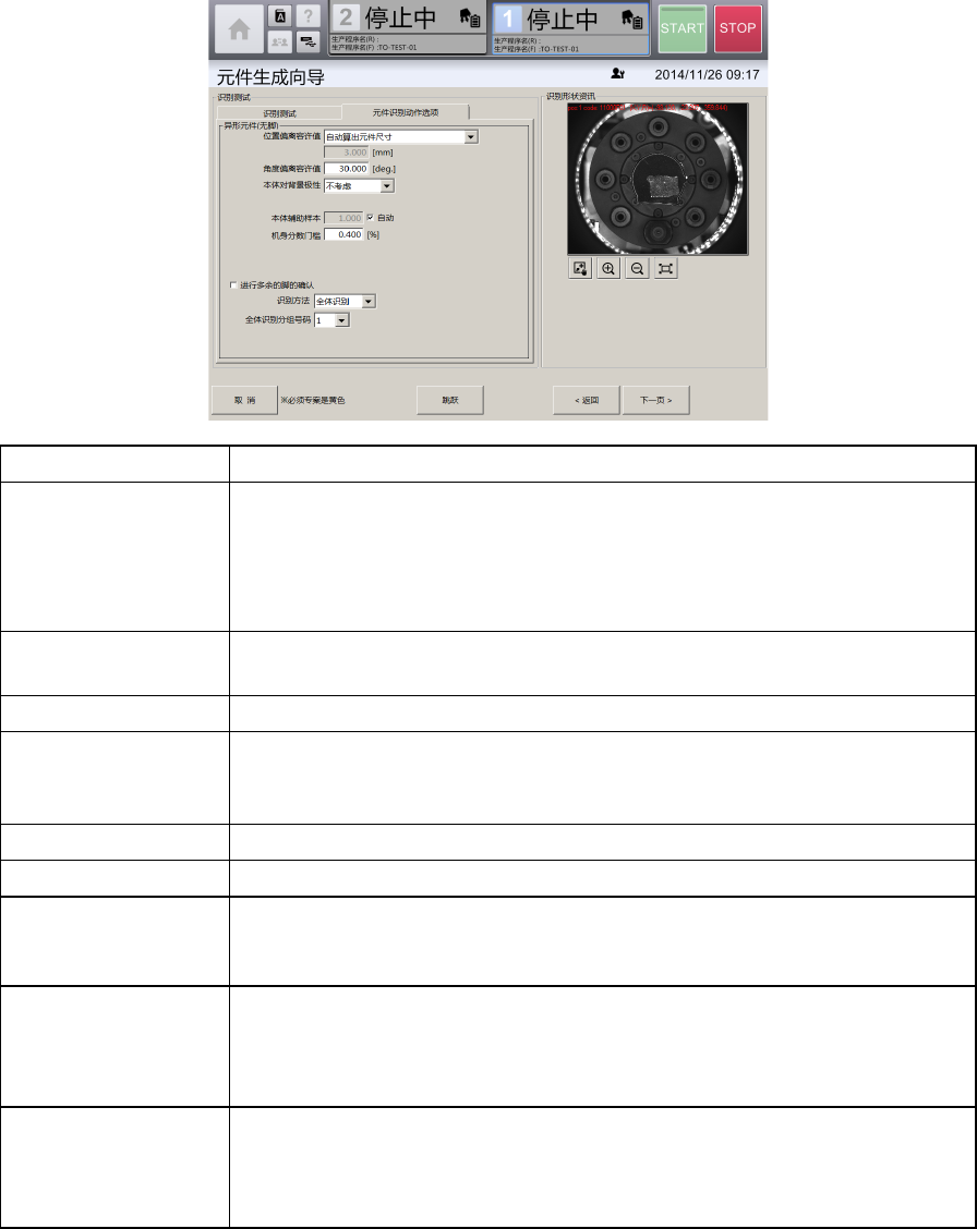 第 4 章 操作篇 4- 13. 元件生成向导 249 4 选择识别选项 ( 异形元件 ( 有脚)) 名称 说明 位置 偏离容许值 从下拉列表中选 择识别元件时 在哪个范围内进行识 别。 • 全 部画面:识别 整个画面。 • 指 定位置:在指 定区域内识别。 • 自 动算出元件尺 寸:考虑角度、角度 偏差的容许值,自动 设定识别 区域后识别。 角度 偏离容许值 对识别得到的元 件角度与预计 元件所在的角度有偏 差时,容许的角度偏 差…