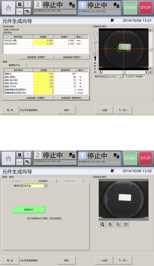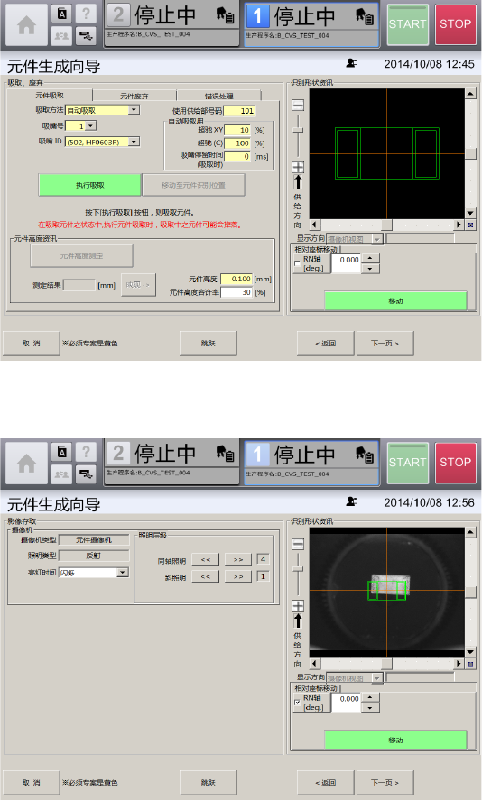 第 4 章 操作篇 4- 14. 数据制作步骤 257 4 10 触摸 [ 下一页 ] 。 显示 [ 识别数据编辑 ] 画面。 11 输入 [ 识别资料编辑 ] 画面中的 [ 本体设定 ] 的各项目。 12 触摸 [ 下一页 ] 。 显示 [ 识别 测试 ] 画面。 [ 识别测试 ] 选项卡,可 在 [ 吸取、废弃 ] 画面 中吸取有元件时,使用 [ 识别资料编辑 ] 画面中制作的元 件识别 数据 ,对元件进行识别 测试。 [ 元件识别…