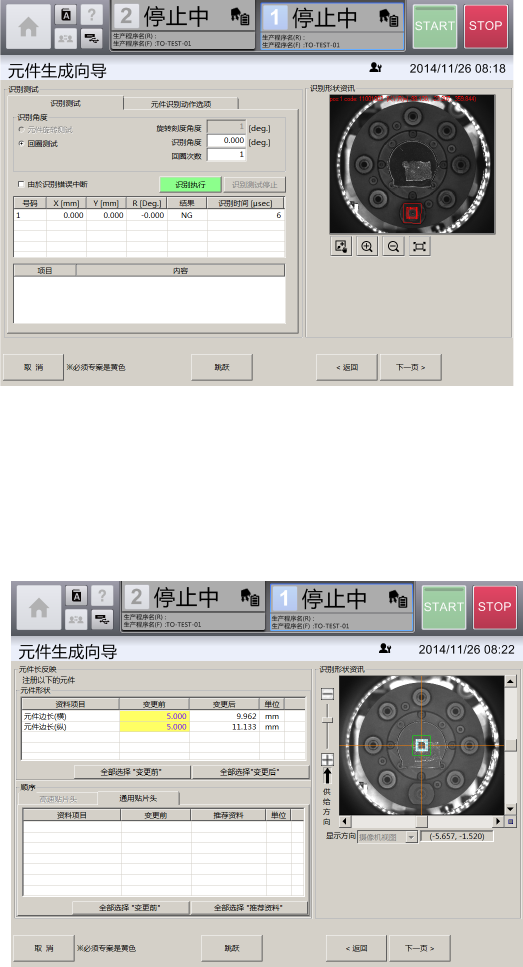 [识别测试]选项卡,可在[吸取、废弃]画面中吸取元件时,使用[识别资料编辑]画面中制作的元件