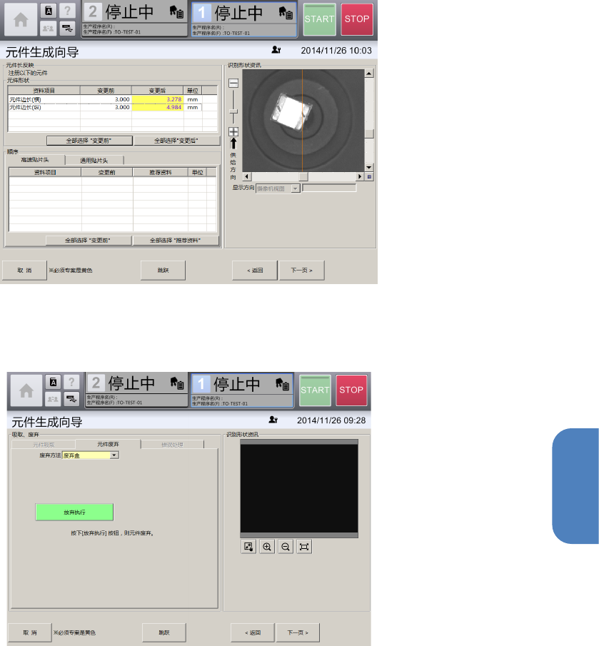 第 4 章 操作篇 4- 14. 数据制作步骤 273 4 11 触摸 [ 下一页 ] 。 在 [ 基本信息 ] 画面中,变更 [ 元件形状 ] 的元件边长(横)或 元件边长(纵),吸 嘴 ID 或 超驰等推 荐数据发生变更 时,会显示 [ 元件 ( 边 ) 长反映 ] 画面。请选择变更前 及推荐数据中注册的 值。 12 触摸 [ 下一页 ] 。 贴片头吸取元件 时,会显示 [ 吸取、废弃 ] 画面 。 废弃 吸取中的元件。 13 触摸…