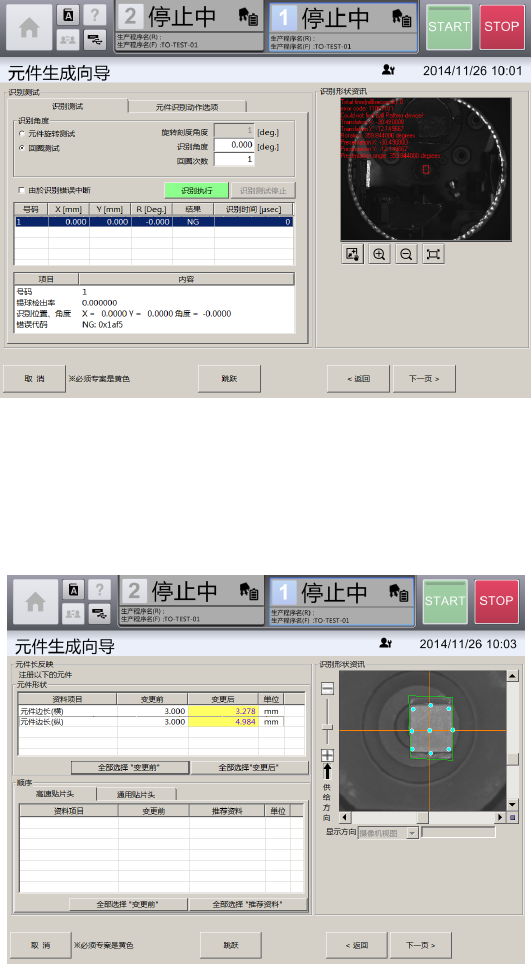第 4 章 操作篇 4- 14. 数据制作步骤 282 12 触摸 [ 下一页 ] 。 显示 [ 识别 测试 ] 画面。 [ 识别测试 ] 选项卡,可 在 [ 吸取、废弃 ] 画面 中吸取元件时,使用 [ 识别资料编辑 ] 画面中 制作的元件 识别数据,对元 件进行识别测 试。 [ 元件识别动作 选项 ] 选项卡,可对元 件识别功能或 背面贴片检测功能的 详细参数进行设定。 13 触摸 [ 下一页 ] 。 在 [ 基本信息 ] 画面中,…