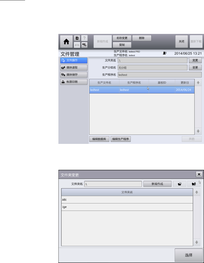 第 4 章 操作篇 4- 14. 数据制作步骤 290 编辑数据 在顶部菜单中按 [ 文件管理 ] - [ 文件操作 ] 的顺序触摸后,将显示文 件操作画面。 如果在 [ 安排 ] – [ 安排 支援 ] 画面中, 生产 程序已被载入,[ 文件操作]画面不能 使用。 如果不想进行 安排 而编辑数据 时,请从生产 程序的重设开始进行 操作。 1 触摸 [ 文件夹名 ] 右侧的 [ 变更 ] 。 显示 [ 文件夹变更 ] 对话框。 有关 […