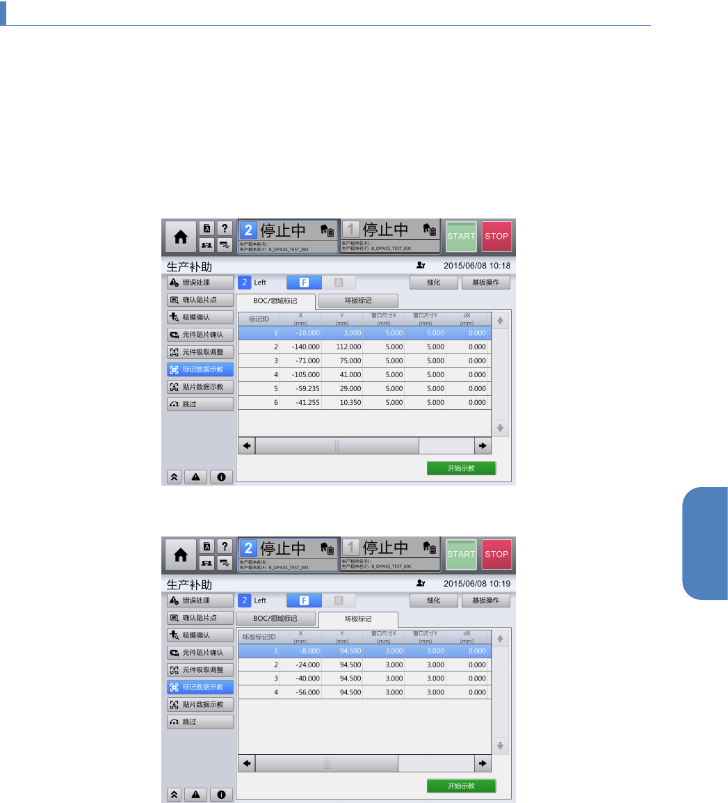 第 4 章 操作篇 4- 15. 示教 303 4 4- 15 - 3. 标记数据 示教 测量 生产程序的贴片 资料 中设定的 BO C / 领域标记、 坏板标记在基板上 的位置,在作为 OCC 目标位置 进 行修正的示教作 业中,可确认 并细化显示测量对象 标记数据,设置测量 用的基板。 触摸 [ 生产补助 ] 菜单中的 [ 标记数据 示教 ] ,显示 [ 标记 数据示教 ] 画面。 [ 标记数据 示教 ] 画面,在用户级别为 [ S…