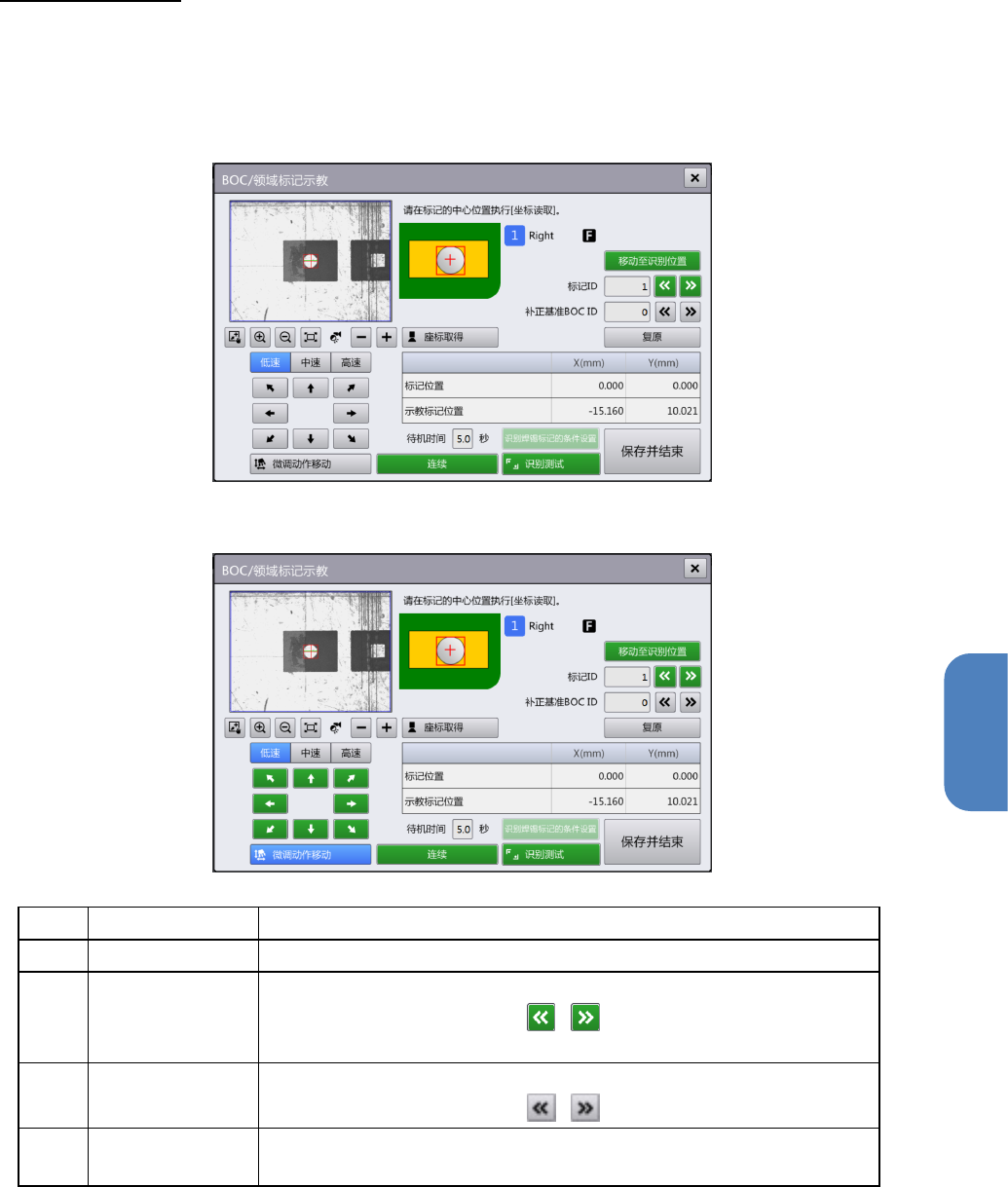 摄像机图像中有 BOC/领域标记的示教点时进行十字标记操作,其他情况下进行微调移动。