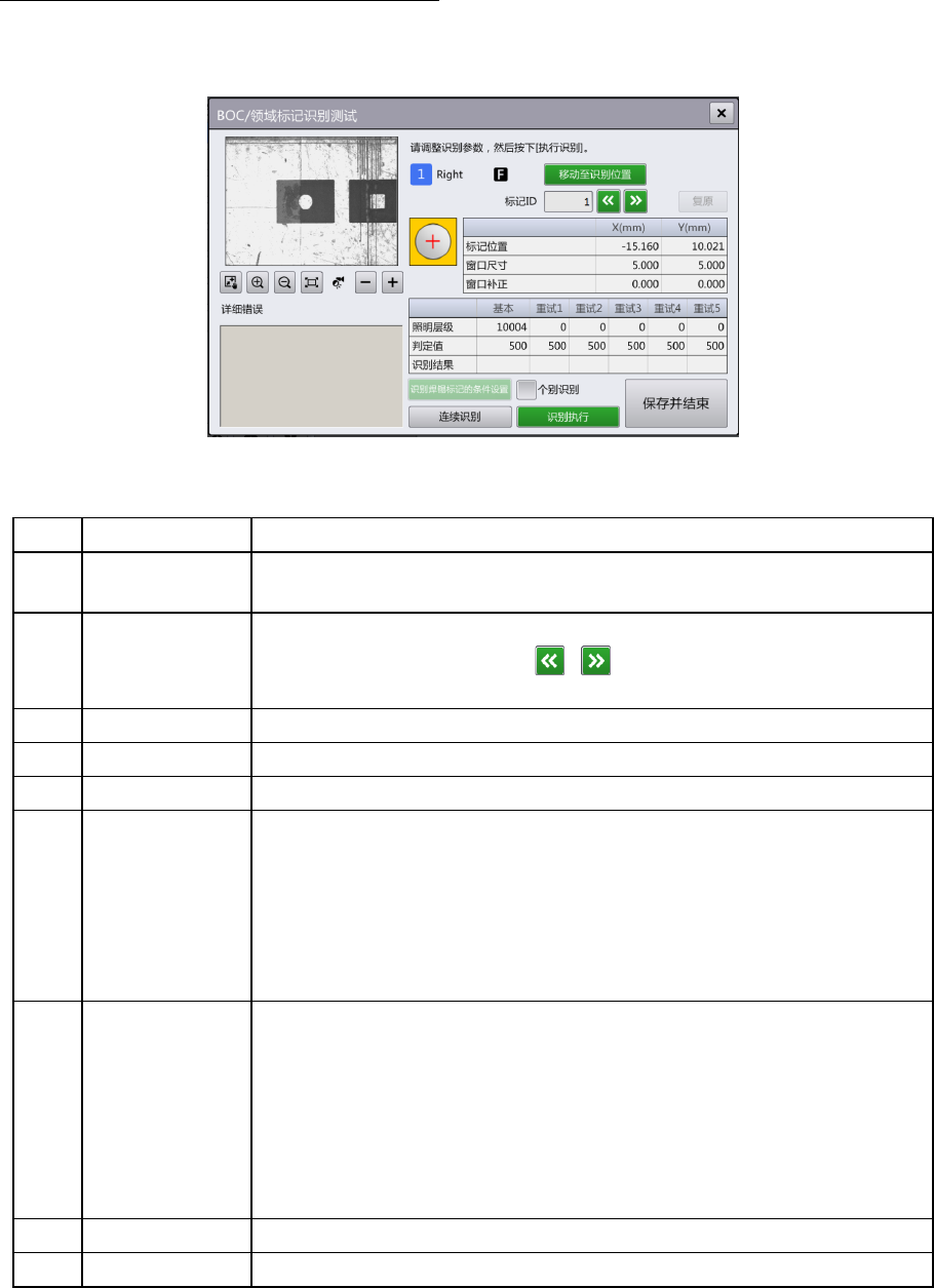 第 4 章 操作篇 4- 15. 示教 311 4 记号 名称 说明 (j) 识别 执行 根据已编辑的参 数条件识别选 择的 BOC / 领域标记的位置 。 (k ) 复原 将选中 BOC / 领域标记的窗口 大小,窗口补 正值,照明层级,分 数值全部 恢复为编辑前的 状态。 (l) 保存并结束 保存所有的识别 测试参数,关 闭 [ BOC / 领域标记识别测试 ] 对话框。 (j) 识别焊锡标记的 条件设置 为了对 焊锡 标记的参数进…
