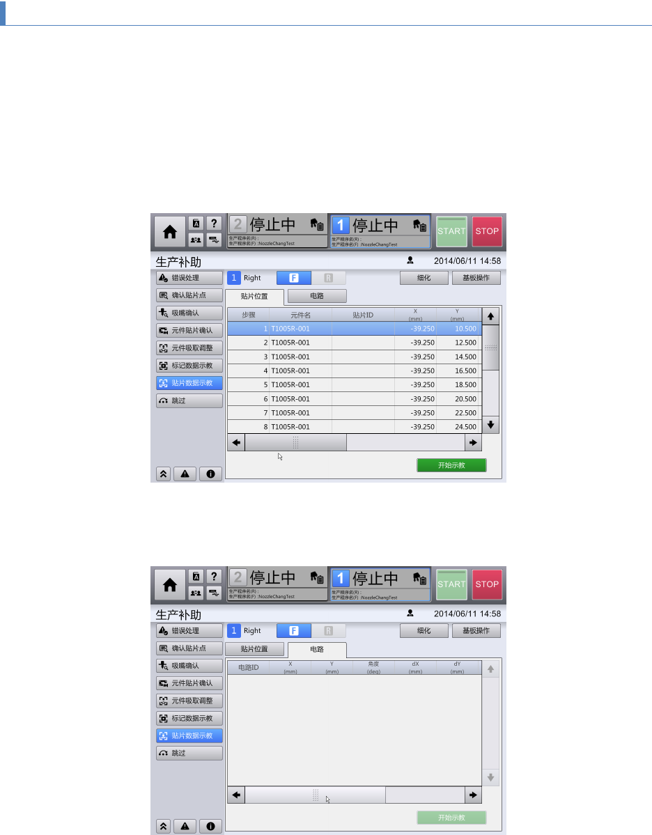 在顶部菜单中按照[生产补助] - [贴片数据示教]的顺序触摸,即显示贴片数据示教画面。