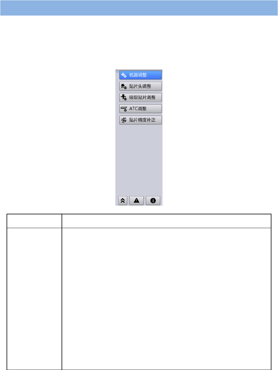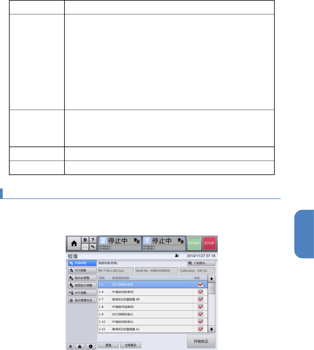 第 4 章 操作篇 4- 16. 校准 334 4- 16. 校准 调整本机的机械 构造,或通过 精度测量计算补正量 ,确保自动运转时能 维持一定的机械动作 精度。 触摸 顶部菜单 中的 [ 校准 ] ,即显示此 菜单。 [ 校准 ] 仅在用户级别为 [ MAINT ENANCE ( 维护 ) ] 时,才会显示 。 校准菜单 菜单 操作 机器调整 • O CC 照明校准 • 算出 OCC 的像素率 • X Y 轴 自动校准 • 基准…