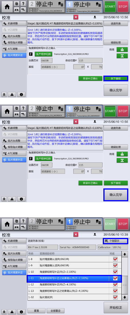第 4 章 操作篇 4- 16. 校准 346 5-7 、拆下玻璃 基板 选择 『 拆下基板』 , 台车 下降后,安全 罩的锁定即被 解除。 请拆下 玻璃基板。 5-8 、保存补正 结果 选择『 确认 完毕』。 (补正 结果 即被保存。) 6 、其他类别的 贴装 精度补正 6-1 、选择角度群组转写 补正结果确认 选择『角度群组转写补 正结果确认 (R)(Z =2 、 100%) 』 ,选择 『 个别显 示』。 6-2 、执行角度群组转…
