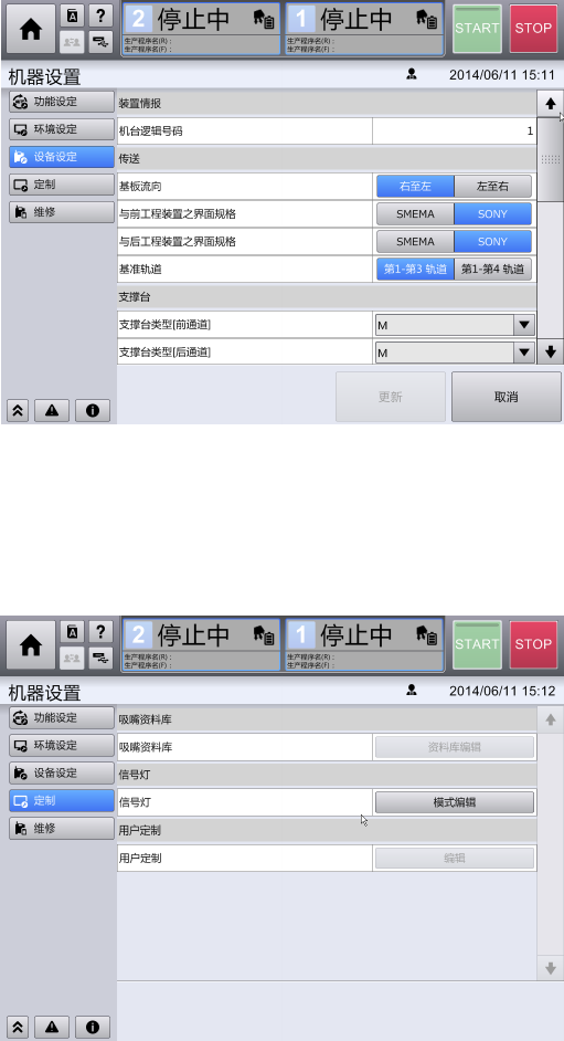 在[定制]画面中,可对吸嘴资料库,信号灯,用户定制等设定进行更改。