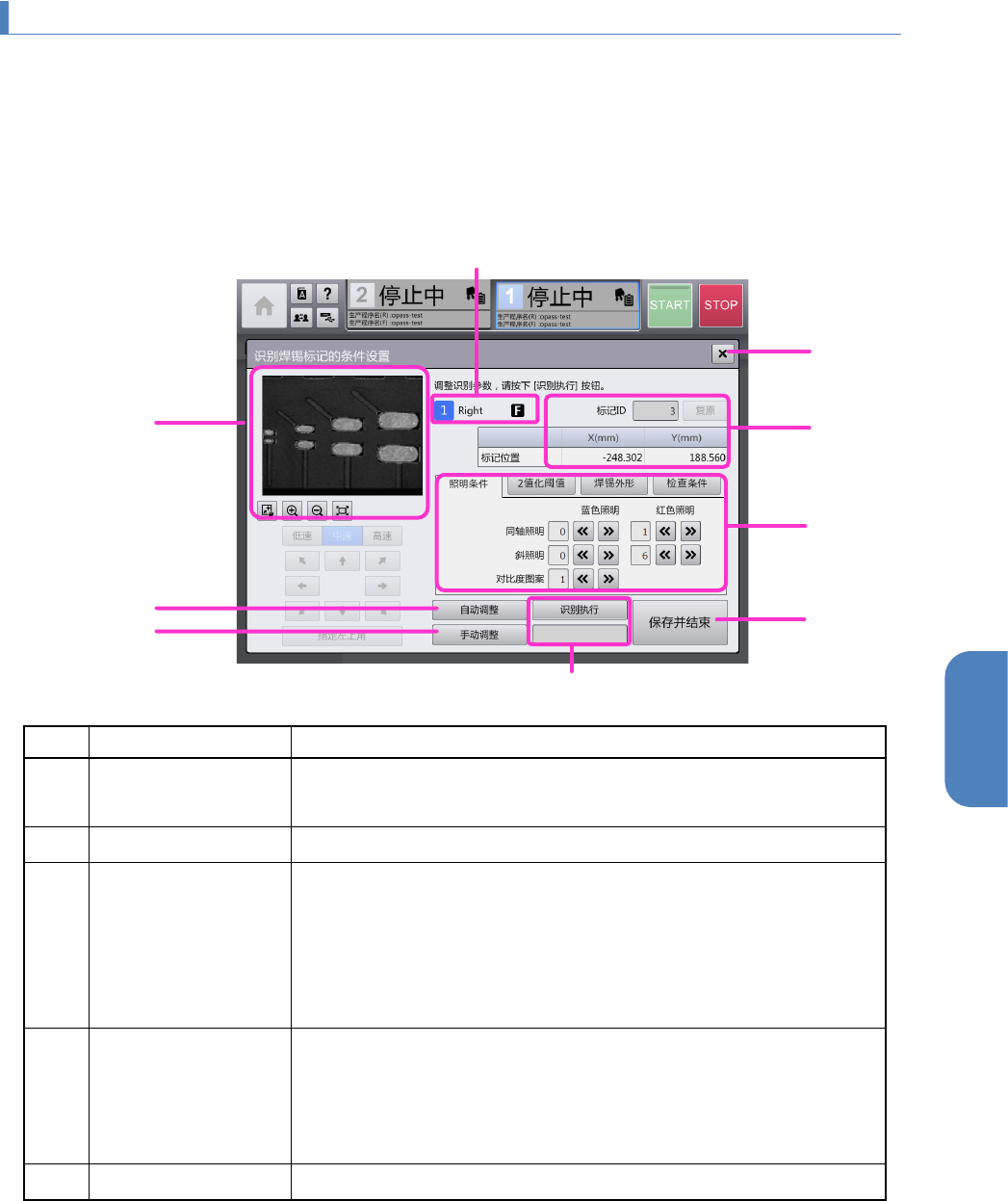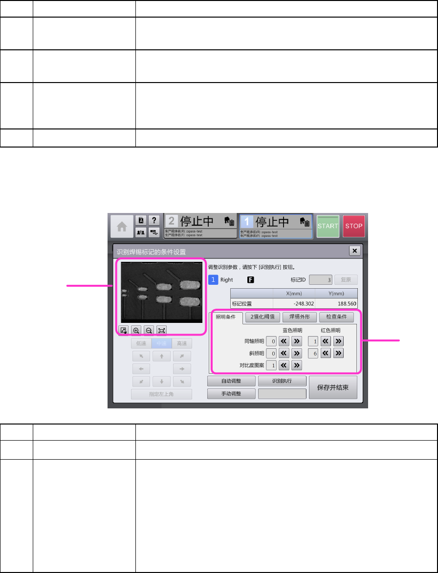 第 4 章 操作篇 4- 18. 识别镀锡印刷补偿贴片位置功 能(选购项) 374 记号 名称 说明 (f) 手动 调整 显示 [ 焊锡识别手动调 整 ] 对话框,用于手动 设定 焊锡 识别周围信 息,在该结果基 础上自动调整 参数。 (g) 识别执行 按照 设定的焊锡识别 条件 进行焊锡 识别 。 在按钮的下侧, 显示 焊锡 识别的结果 (OK/NG) 。 (h) 保存 并 结束 对编辑 焊锡 识别条件 后的 值 进行 确定。 如果对…