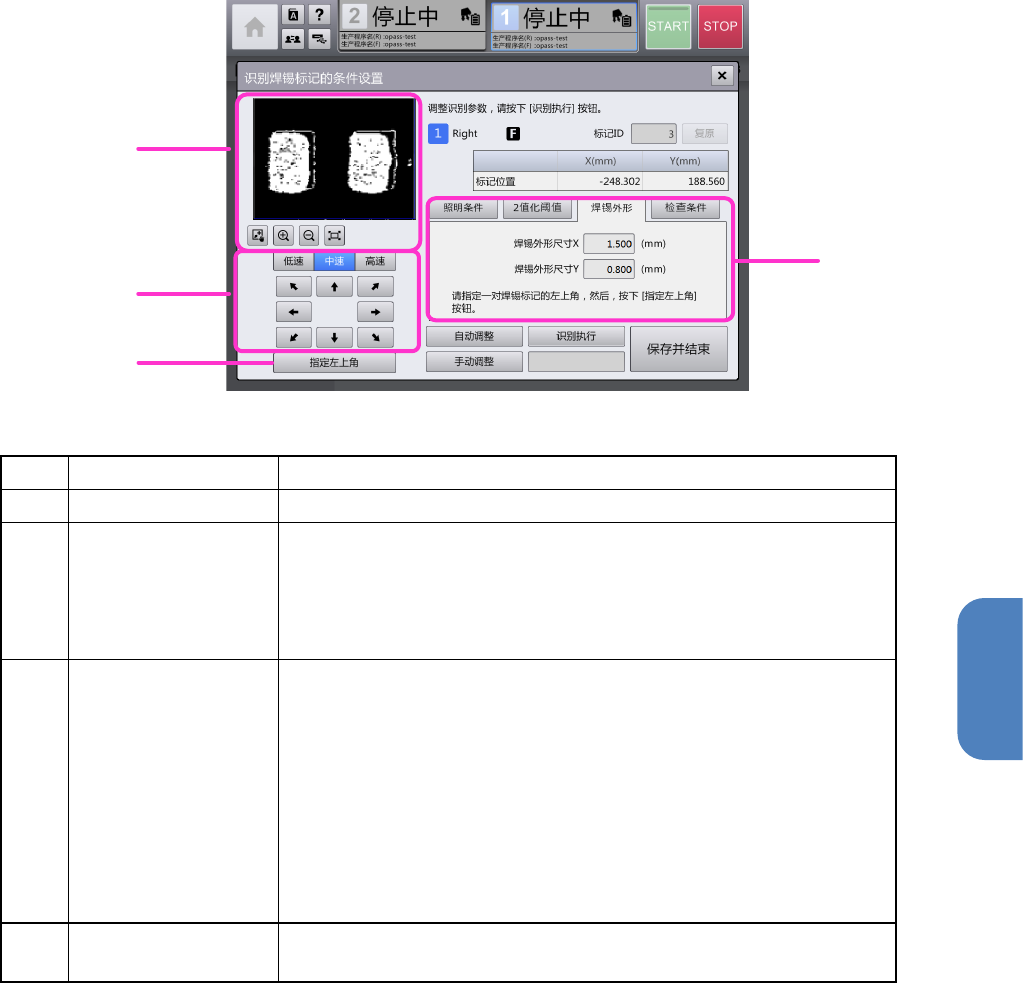 第 4 章 操作篇 4- 18. 识别镀锡印刷补偿贴片位置功 能(选购项) 377 4 焊锡外形 记号 名称 说明 (a) OCC 监视器 显示 摄像图像及焊锡 外形 领域。 (b) 焊锡 外形 调整 识别焊锡的以下 参数 。 • 焊锡 外形尺寸 X :在 0.001 ~ 8.000 范围内调整 1 组焊锡外形的横 方向 尺寸。 • 焊锡 外形尺寸 Y : 在 0.001 ~ 8.000 范围内调整 1 组焊锡外形的 纵方向 尺寸 …