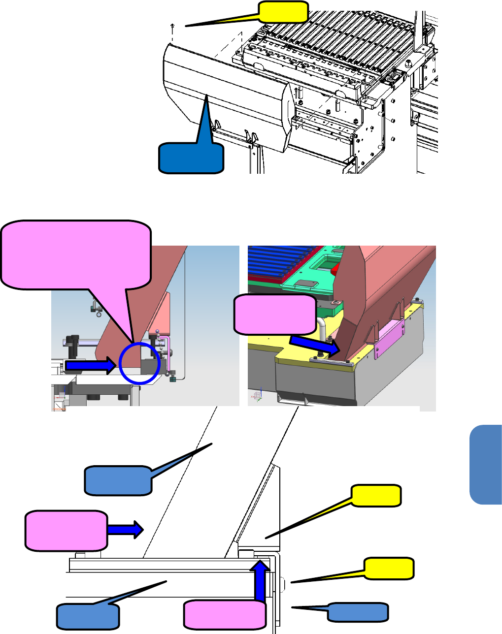 第 5 章 维护 篇 5- 2. 保养检查 49 5 8 .请用螺丝固定滑带槽 上部。 9 .在用上部的 螺丝 临时固定 滑带槽 单元的状态下 ( 步骤⑦ ) , 先 安装滑带槽 下部。 在将 滑带槽 下部 按压在切 带器 单元的状态下,安装 支架 。 滑带槽 螺丝 向箭头方向按住固定, 使滑 带槽单元与切带器 部接触。 按住。 滑带槽 螺丝 切带器 支架 螺丝 按住支架 按住 滑带槽