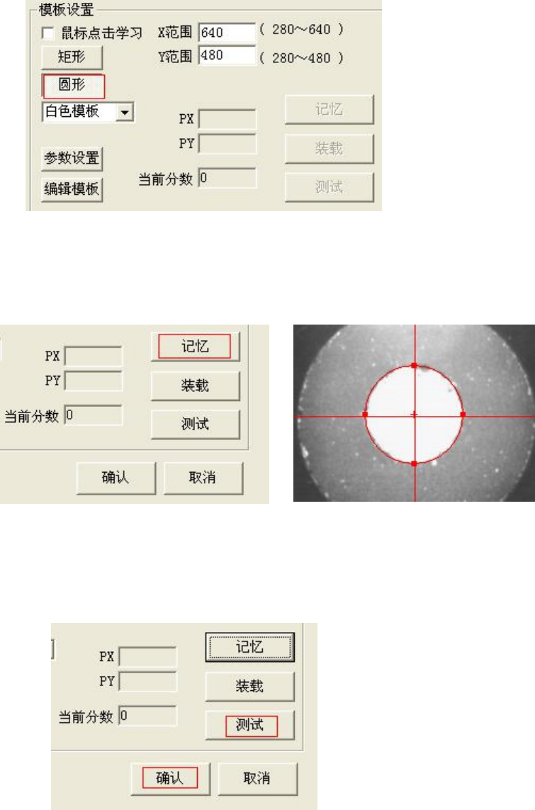 学习则要看 mark 的形状是圆形或是其它形状,是圆形的则选“圆形”, 是其它形状则选“矩形”。(如下图) 第二十二步: 以 mark 的圆心为圆心用鼠标画一个与 mark 差不多大小的圆, 然后点击“记忆”。(如下图) 第二十三步: 点击“测试”及“确定”完成 P CB 标志 1 。 ( 如下图 ) 第二十四步: P CB 标志 2 与 PCB 标志 1 的捕抓方法一样。