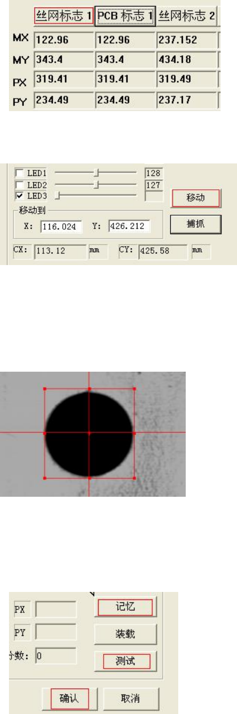 第二十八步: 点击“丝网标志 1 ”。如下图 第二十九步: 点击“移动”,移动后只要钢网的 m ark 点在图像中心周围即 可。 第三十步: 点击 “捕抓” , 以画正方形方式把钢网 mark 点框住, 大小比 mark 稍大一点即可。(如下图) 第三十一步: 点击“记忆”、“测试”及“确定”来完成钢网 mark 的学习。 (如下图)