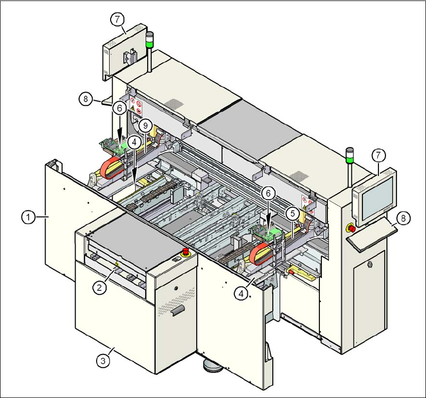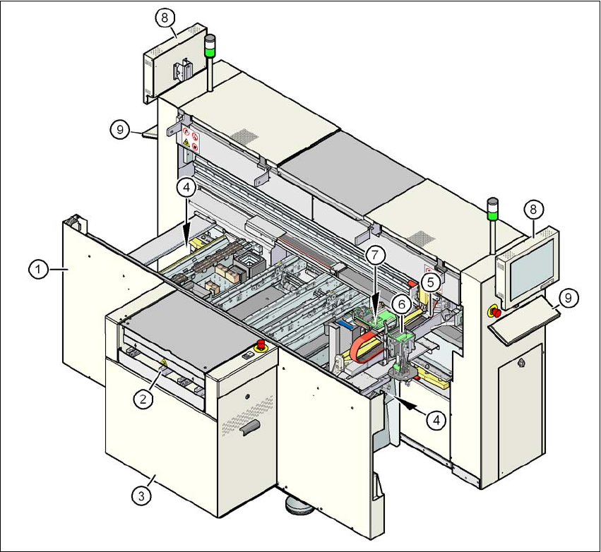 用戶手冊 SIPLACE D1/D2 3 取置機的技術資料 源自軟體版本 SR.605.xx 07/2008 英文版 3.5 模組概述 109 3.5 模組概述 3.5.1 SIPLACE D1 模組概述 3 圖 3.5 - 1 SIPLACE D1 模組概述 (1) 取置機機架 (2) PCB 輸送帶 (彈性雙輸送帶 ) (3) 擴充套件 (4) 料帶裁斷器,廢料帶導槽 ( 2 個) (5) 懸臂 1 (6) 取置頭 (7) C&am…