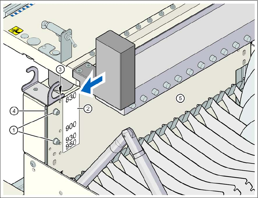 4 組立與啟用 用戶手冊 SIPLACE D1 /D2 4.4 依 PCB 輸送帶高度調整料站台車 源自軟體版本 SR.605.xx 07/2008 英文版 218 4 圖 4.4 - 1 料站台車上環首螺栓的位置 (1) 環首螺栓的 M12 孔 (2) 環首螺栓, DIN 580 M12-S t (3) 垂直側梁 (4) 內六角螺絲, M6x12 及墊片, 8 個 (5) 跨接線