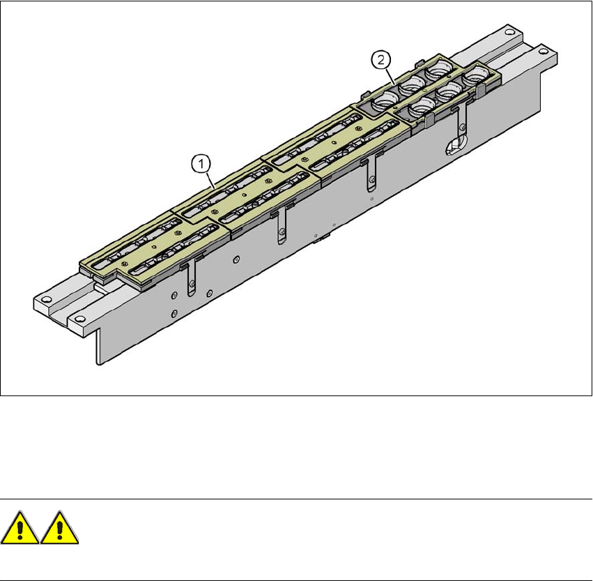 → 首先將吸嘴匣中有編號為吸嘴 1、 2、 3、 4 的一側放到基座上。固定夾 ( 圖 6.1 - 5