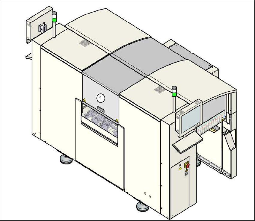 2 作業安全 用戶手冊 SIPLACE D1/D 2 2.6 安全設備 源自軟體版本 SR.605.xx 07/2008 英文版 68 2 圖 2.6 - 3 取置機上 S tart (啟動) 鈕 (白色) 的位置 (1) 取置機上 St a r t (啟動) 鈕 (白色)