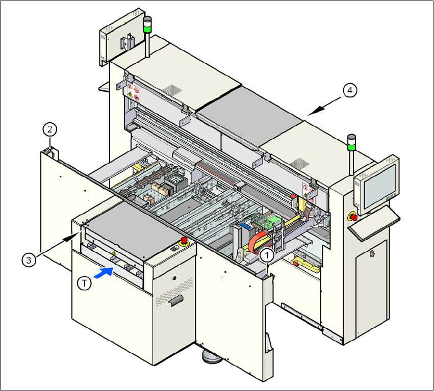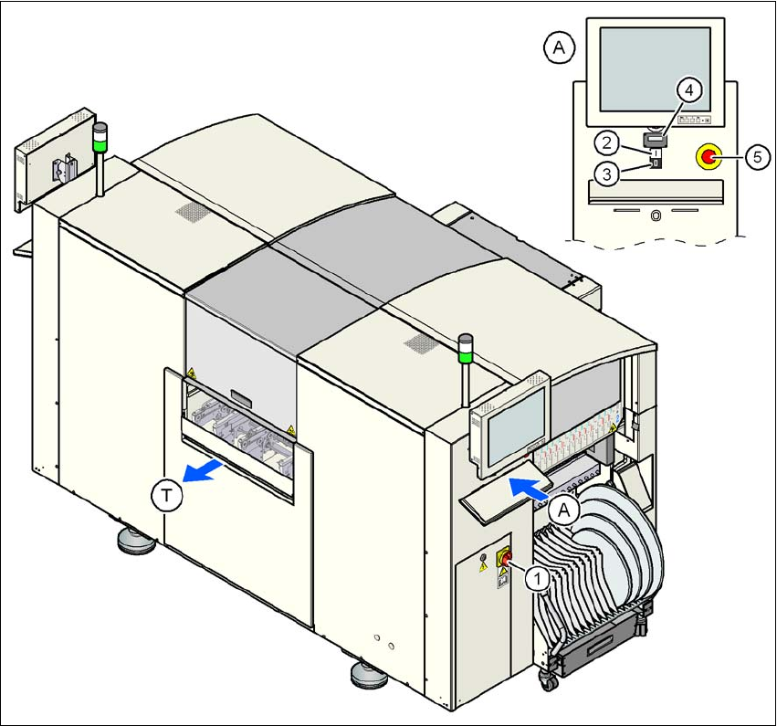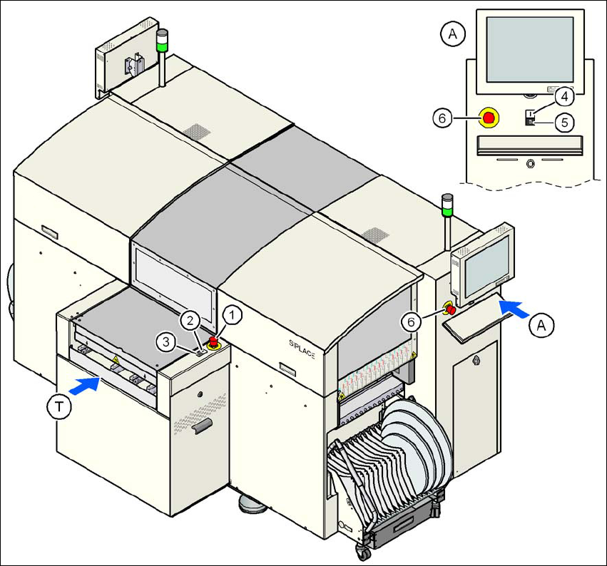 2 作業安全 用戶手冊 SIPLACE D1/D 2 2.6 安全設備 源自軟體版本 SR.605.xx 07/2008 英文版 70 2 圖 2.6 - 5 開關和按鈕的位置 - 從 PCB 輸入側檢視 (1) 輸入板邊上 的 EMERGENCY STOP (緊急停機) 鈕 (2) 輸入板邊上 的 S tart (啟 動) 鈕 (白色) (3) 輸入板邊上 的 St o p (停止) 按鈕 (白色) (4) 壓縮空氣裝 置側作業面板上…