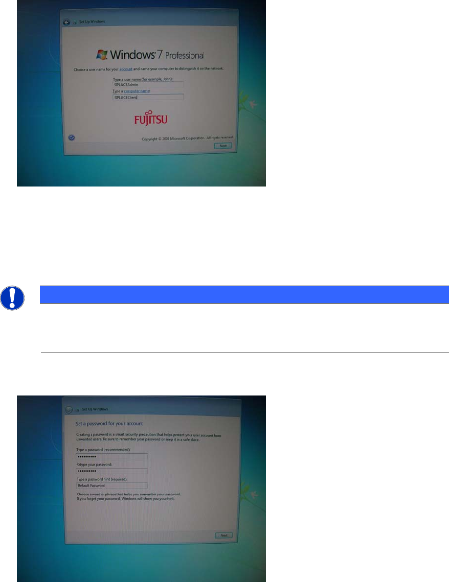 Celsius W510 with Win dows 7 10/2011 Edition The next window appears. Figure 3-6: Account- and Computername ► Enter the account name “ SIPLACEAdmi n”. ► Enter the name for the computer. ► Click the Next button to continu…