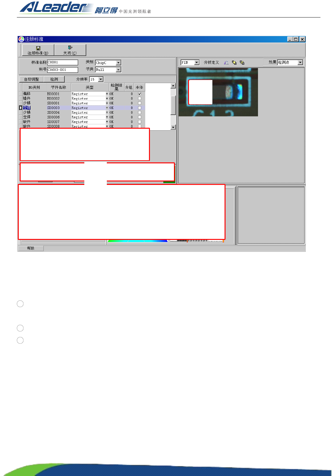 3 判定区域 : “ 少锡 ” 的判定范围为( 45 , 100 ) , “ 空焊 ” 的判定范围为( 0 , 20 ) 。