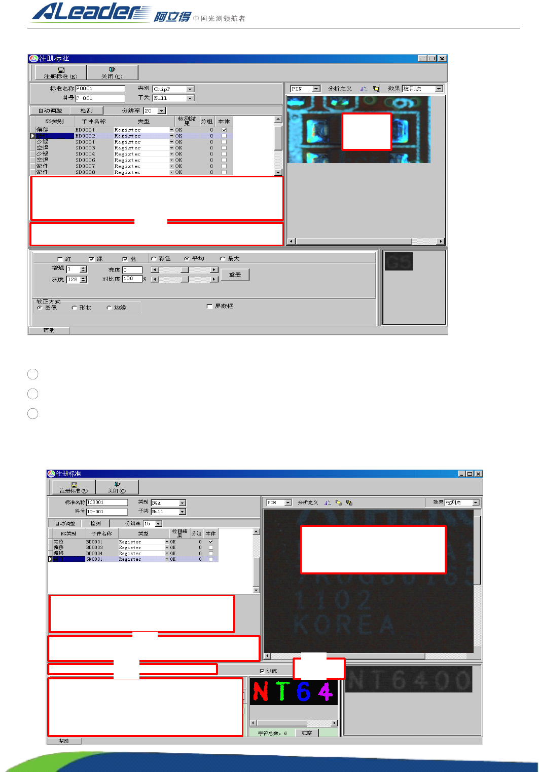 地址: 东莞市东城区牛山金鸡岭兴华工业园 F 栋 电话: +86-0769-22629057 传真: +86-0769-22629107 Http:www .aoichina.com TEL:4001 -189-123 F A X:0769-231020 60 Page: 120 上图为 “ OCR ” 算法下的注册窗 体,说明如下 : 1 ROI 区域: ROI 区域 要框字符部 分,左右边界 各多出字体部分 1 个字符 。 2 检测…
