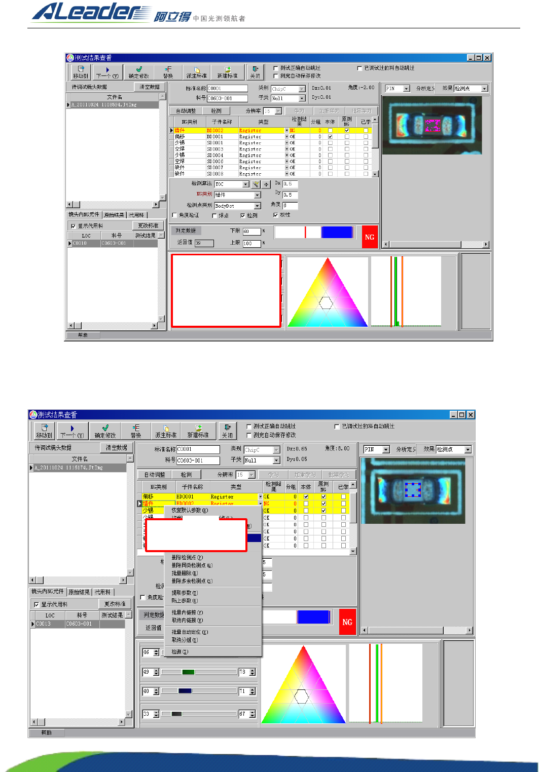 上图为 “ 错件 ” 误报调试窗体, 待测元件的本体色彩与亮度与标准本体的色彩和亮度差异不大,该状态下