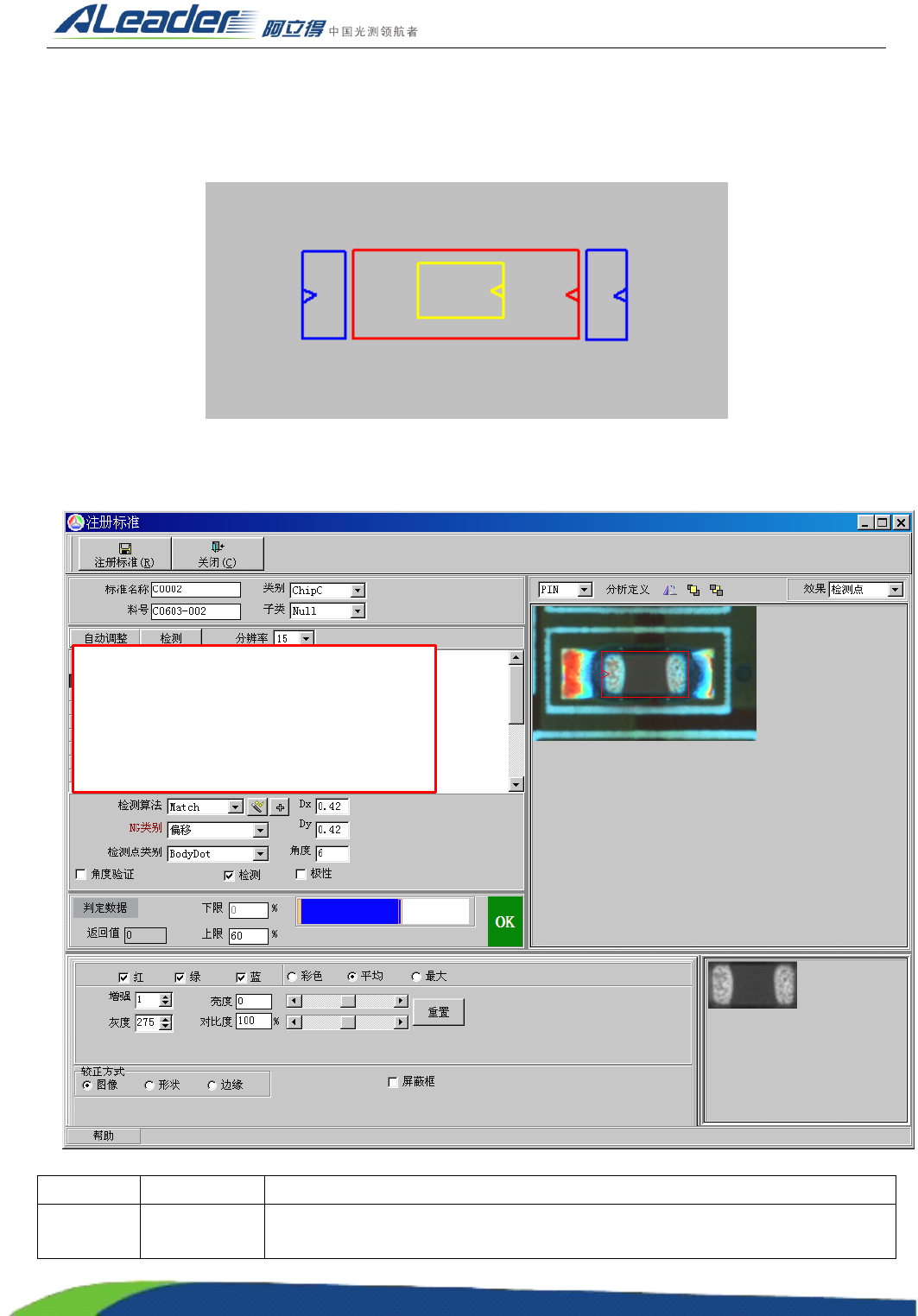 上图中,红色框为主体框,蓝色框为少锡(空焊、缺件)框,紫色框为错件框,黄色框为极性框。其注册