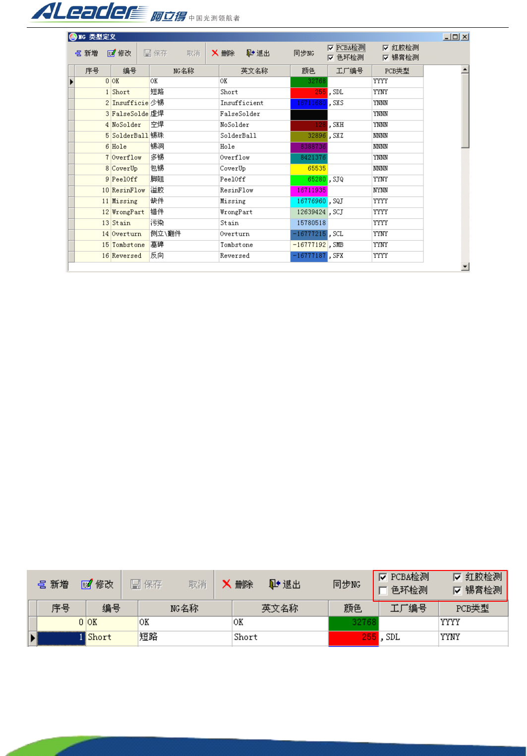 ⑴ 新增,修改,删除:对 NG 类型的基本操作,用户可根据需要添加新的 NG 类型,修改已有类型的