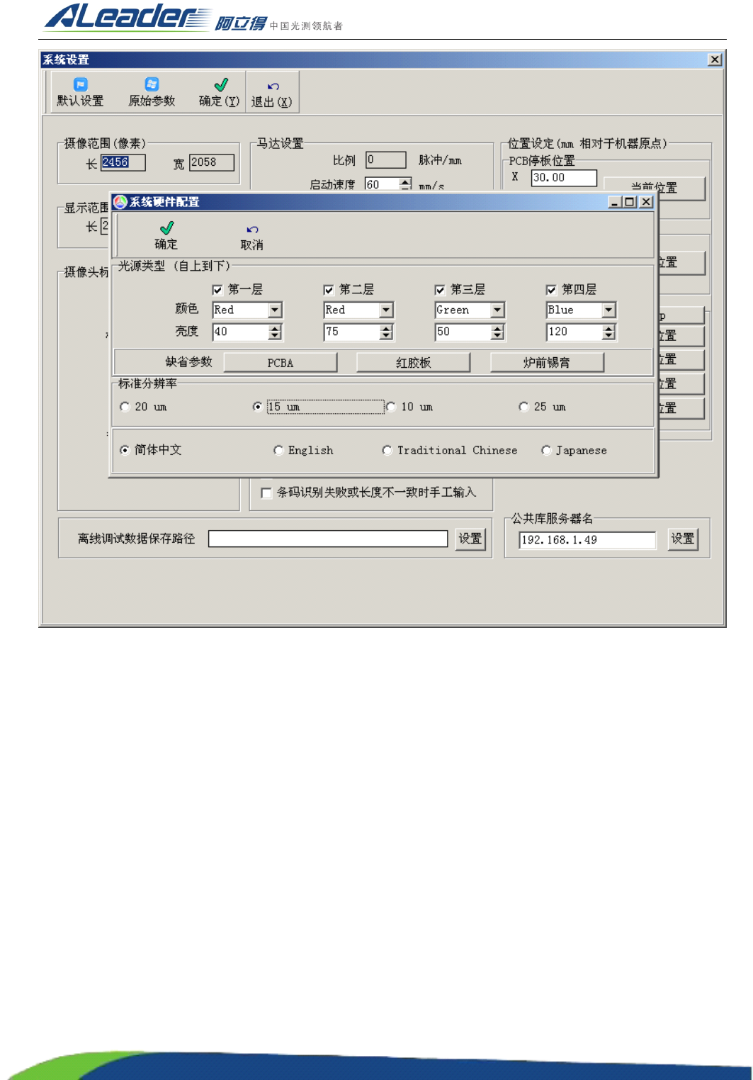 (3) 每二层开灯时的标准亮度,可以通过点击按钮 ” PCBA ” , “ 红胶板 ” , “ 炉前锡膏 ” 来自动设定标准亮度 ;