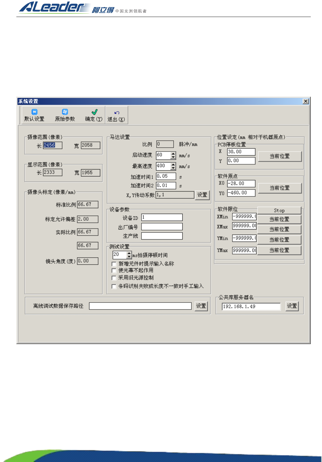 地址: 东莞市东城区牛山金鸡岭兴华工业园 F 栋 电话: +86-0769-22629057 传真: +86-0769-22629107 Http:www .aoichina.com TEL:4001 -189-123 F A X:0769-231020 60 Page: 22 2.2.2 2.2.2 2.2.2 2.2.2 系统参数设定 此窗口可查 看或设定 如下系统 参数: (1) 查看相机的 摄像范围 ( 从而可 知相机拍摄每 幅…