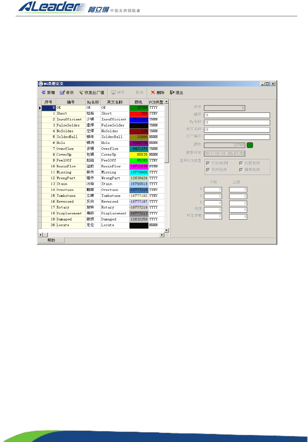 2. 修改 : 可对当前行的 NG 类型在窗口右边进行修改 , 改完后要保存才生效 ;