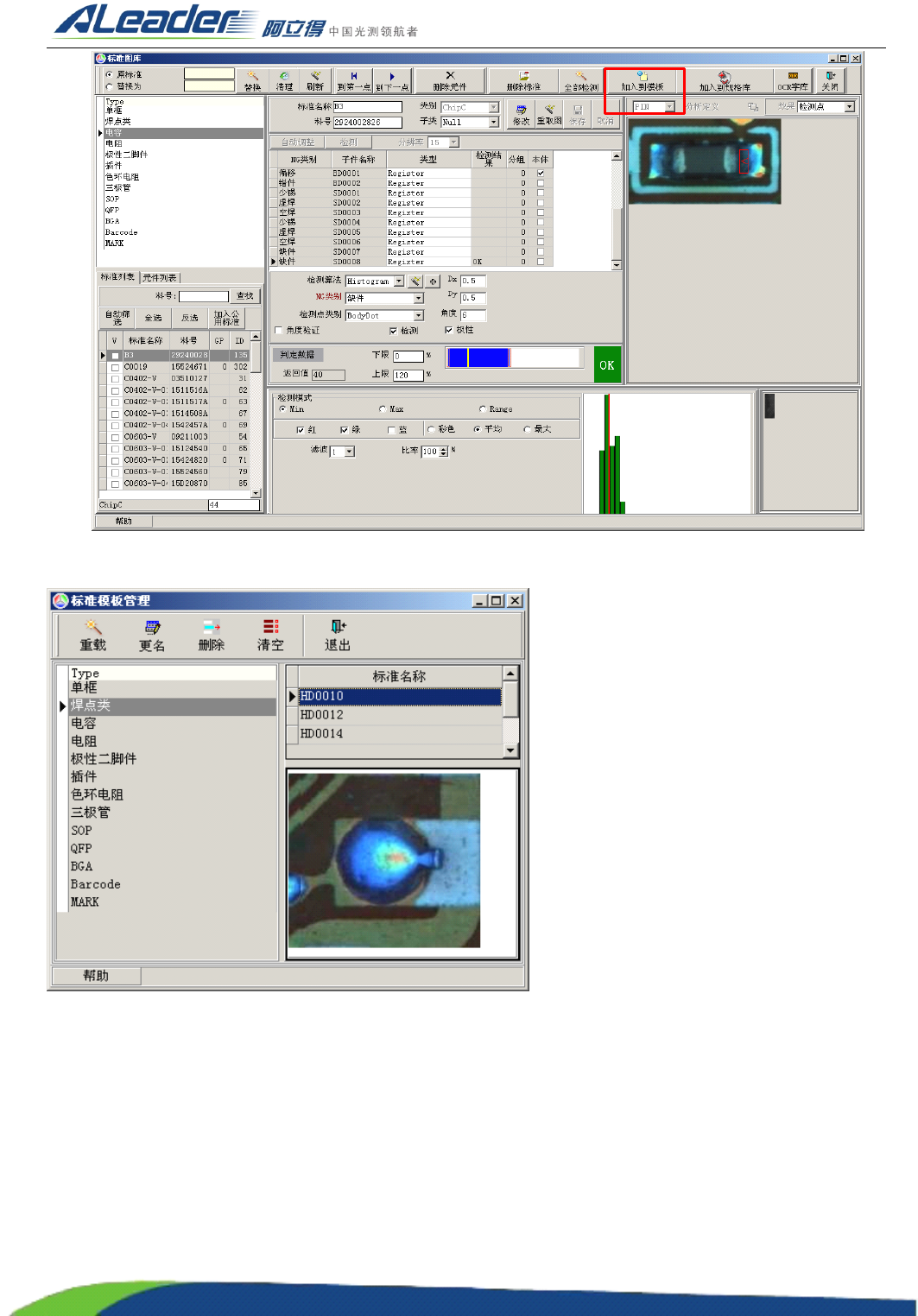 打开标准图库 [ 编辑 ]->[ 编辑标准图库 ], 选中需要加入到标准模板的标准 , 点击下图中红色框所示的 [ 加入