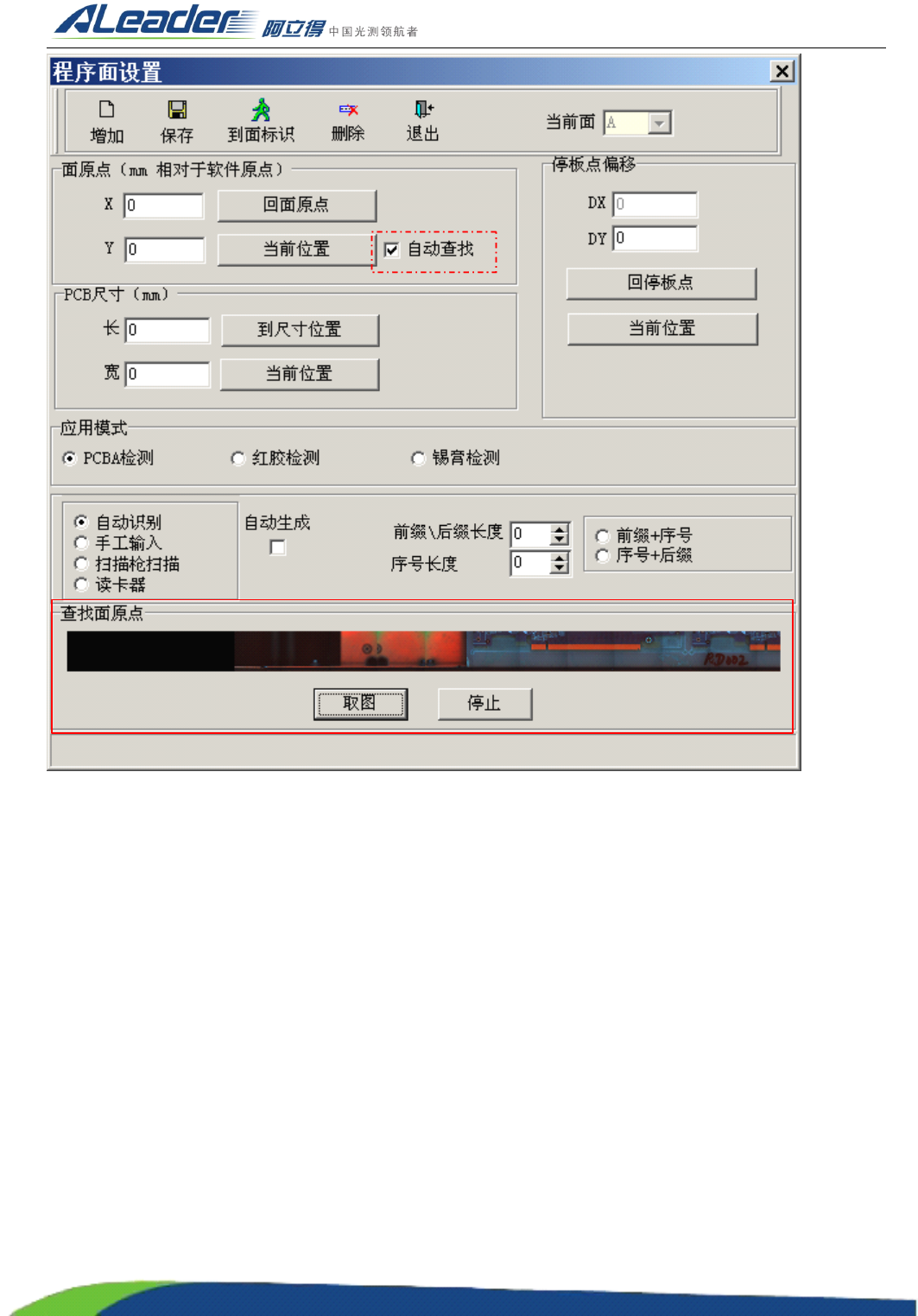 示内容 , 然后点击取图 , 机器就会自动抓取靠近轨道下沿的图像 , 我们可以从图像中找到 PCB 板左下角位