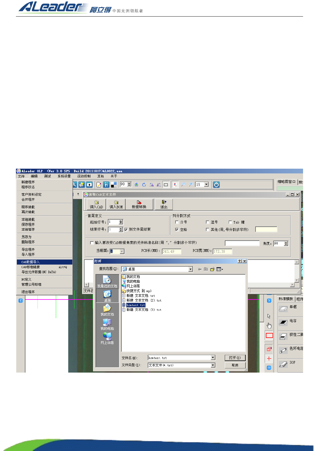 校正 mark 点 。 单击 [ 文件 ] 菜单栏下的 [CAD 数据导入 ] 选项 弹出窗口读取 CAD 文本文件 , 点击 [ 调入 CAD]