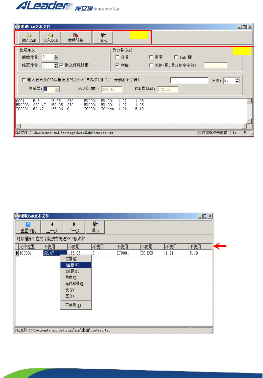 4 ) CAD 数据列表:载入的 CAD 元件数据清单。