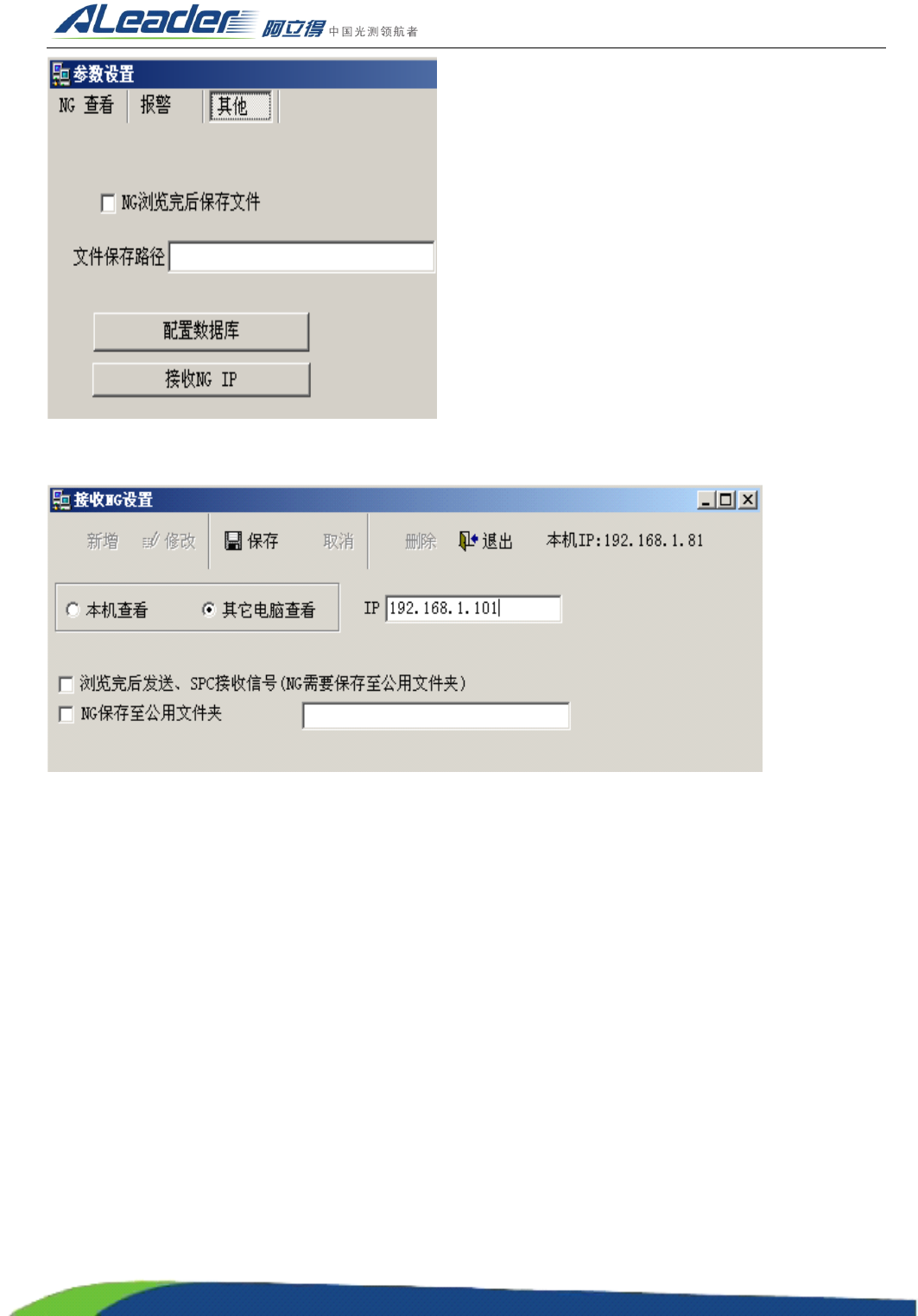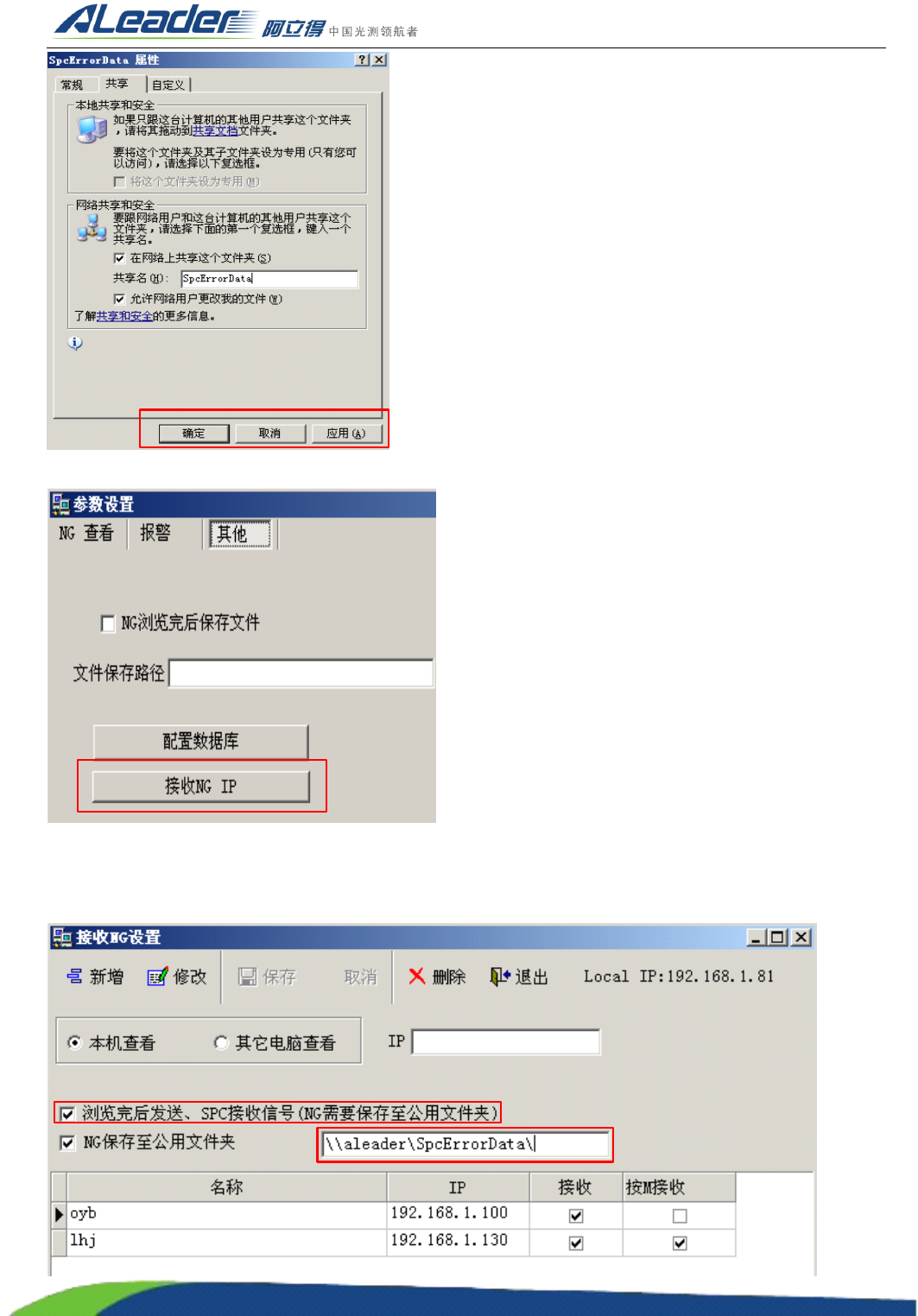 地址: 东莞市东城区牛山金鸡岭兴华工业园 F 栋 电话: +86-0769-22629057 传真: +86-0769-22629107 Http:www .aoichina.com TEL:4001 -189-123 F A X:0769-231020 60 Page: 62 再打开 NG 查看里的系统设置, 选择其他,接收 NG IP : 勾上浏览完 后发送 、 S PC 接收信号 ( NG 需要保存至 公用文件 夹 ) 选 项和 …