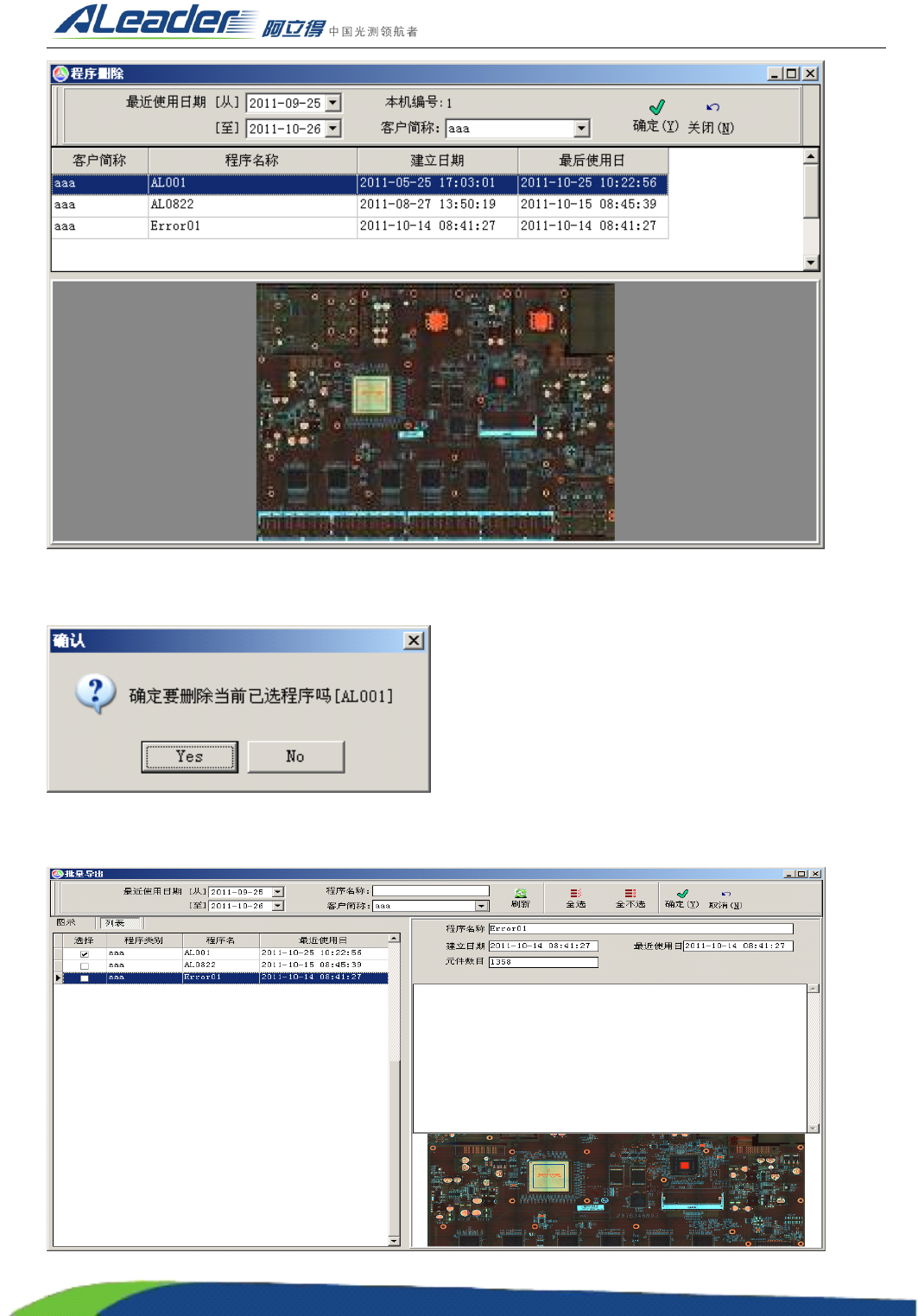 地址: 东莞市东城区牛山金鸡岭兴华工业园 F 栋 电话: +86-0769-22629057 传真: +86-0769-22629107 Http:www .aoichina.com TEL:4001 -189-123 F A X:0769-231020 60 Page: 71 i. 按 条件显示程序 列表 ; ii. 定位到要删 除的程序 , 点击确定 ; (10) 导出程序