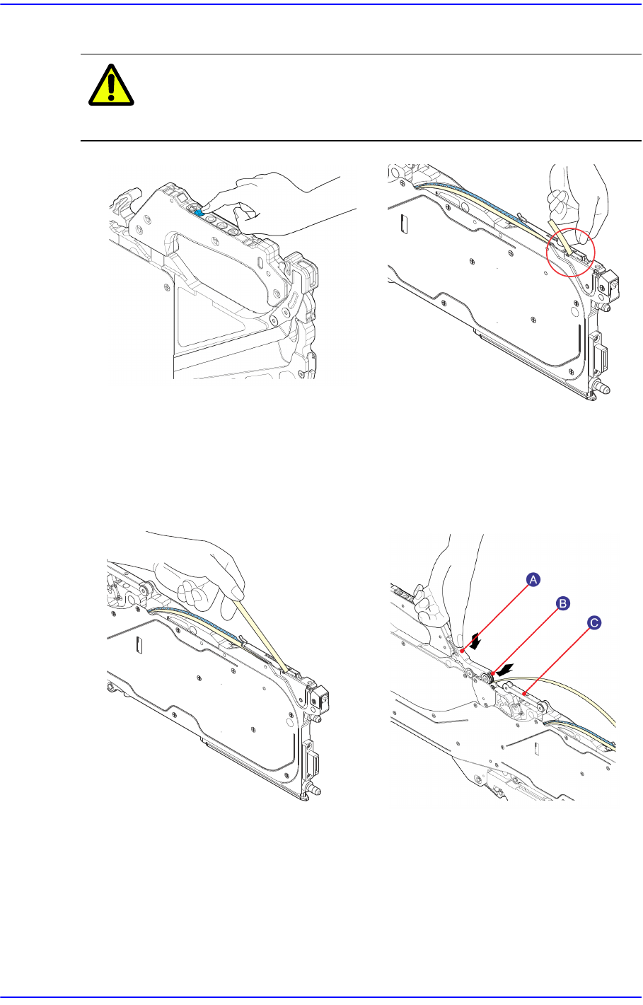 5) 利用Drain Tensioner把从前方塑料间隙出来的上封带夹入Drain Handle 之间。