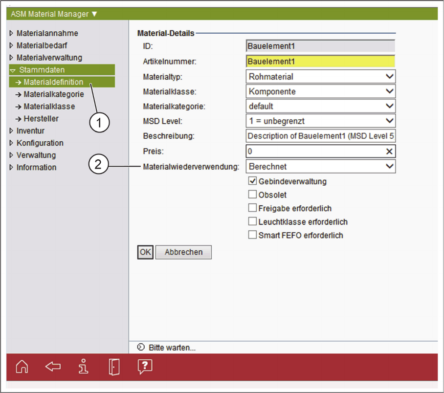 ► Wählen Sie Stammdaten => Materialdefinition (1) aus der Baumstruktur von ASM Material Manager